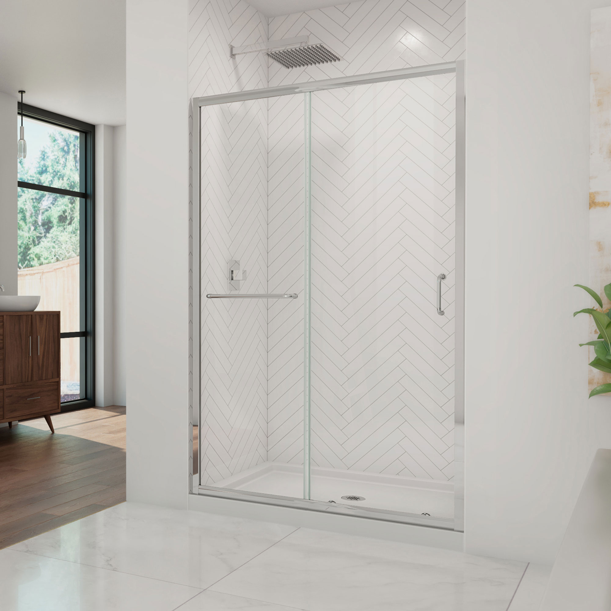 | 9 Set - Bullet 03 | Infinity-Z Shower Door: Quality 1/4 in. (6mm) thick certified tempered glass; Reversible for right or left layout; Convenient towel bar |
