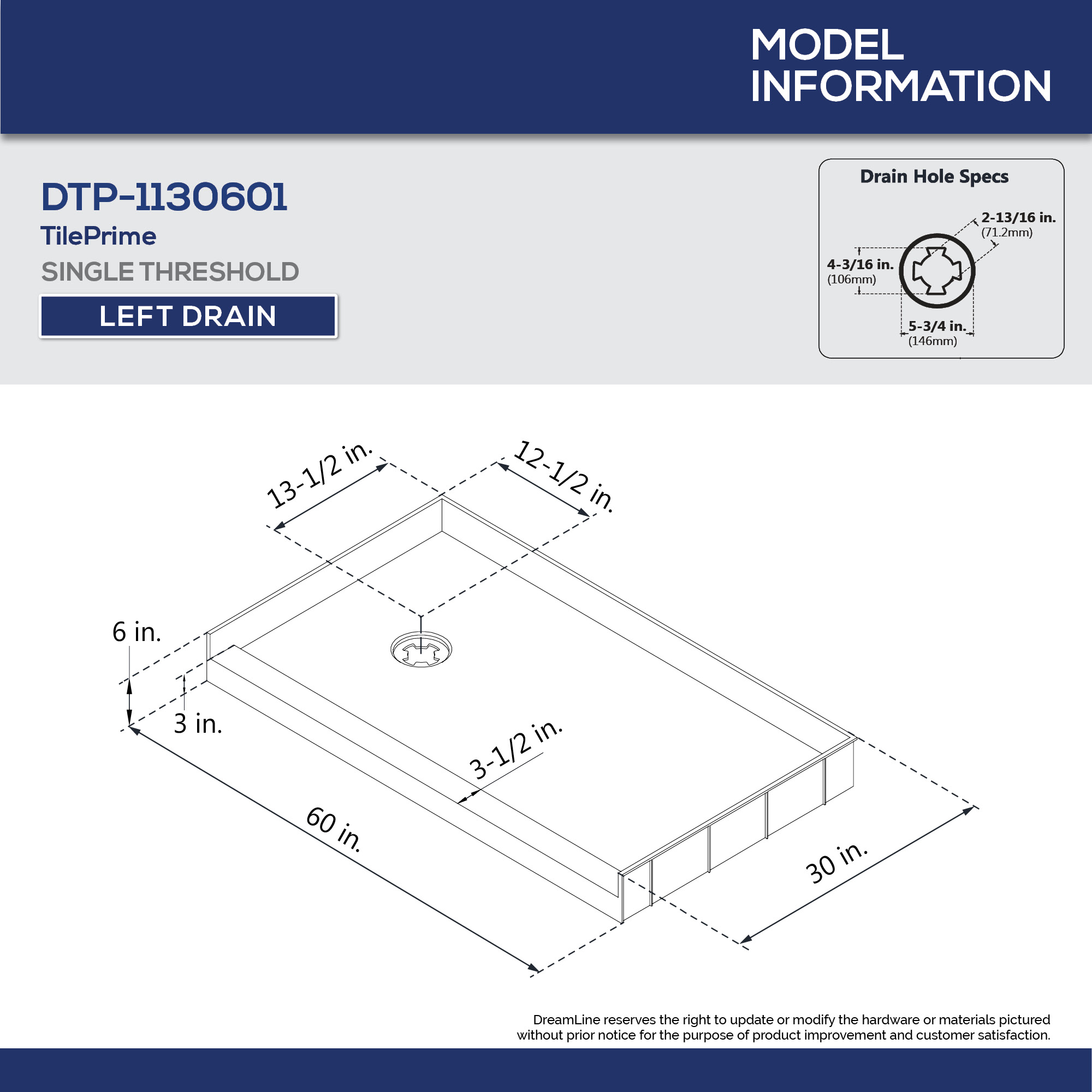 | Product Name | DreamLine TilePrime 30 inch D x 60 inch W x 3 inch H Left Drain Single Threshold Shower Base |