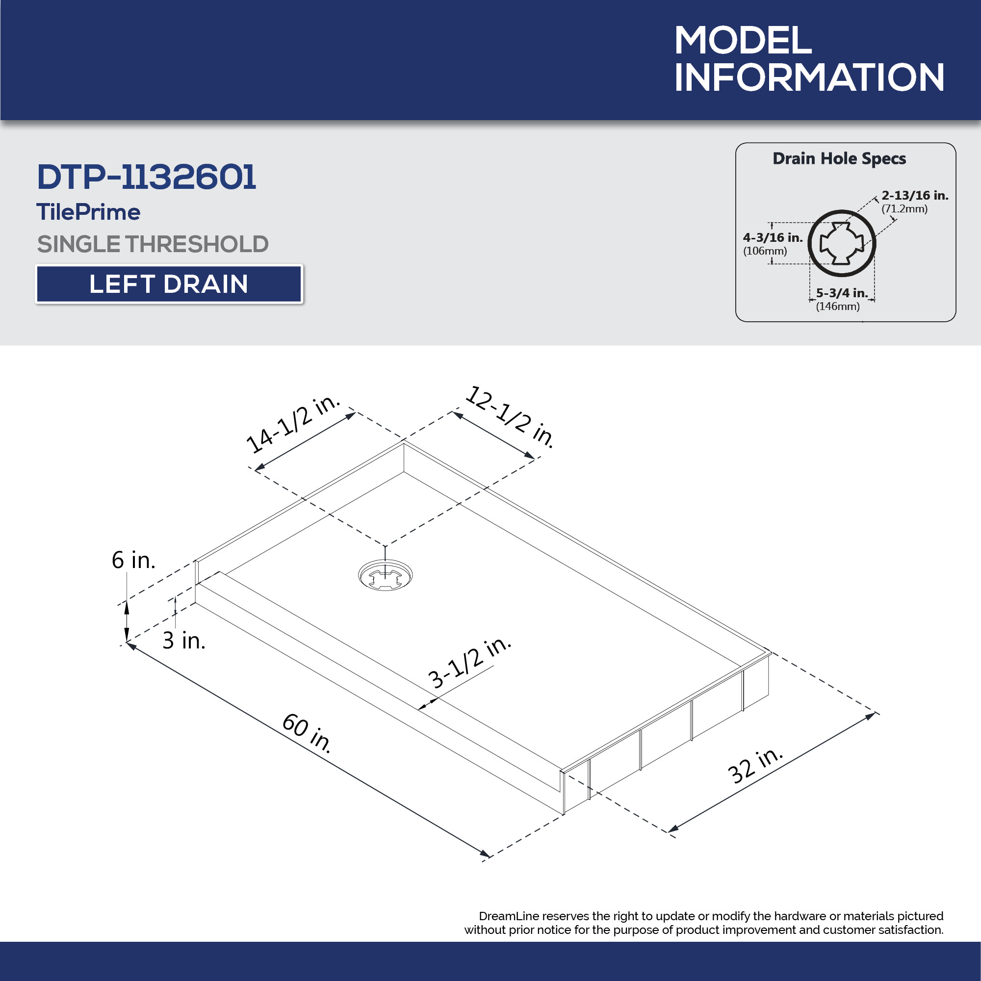 | Product Name | DreamLine TilePrime 32 inch D x 60 inch W x 3 inch H Left Drain Single Threshold Shower Base |