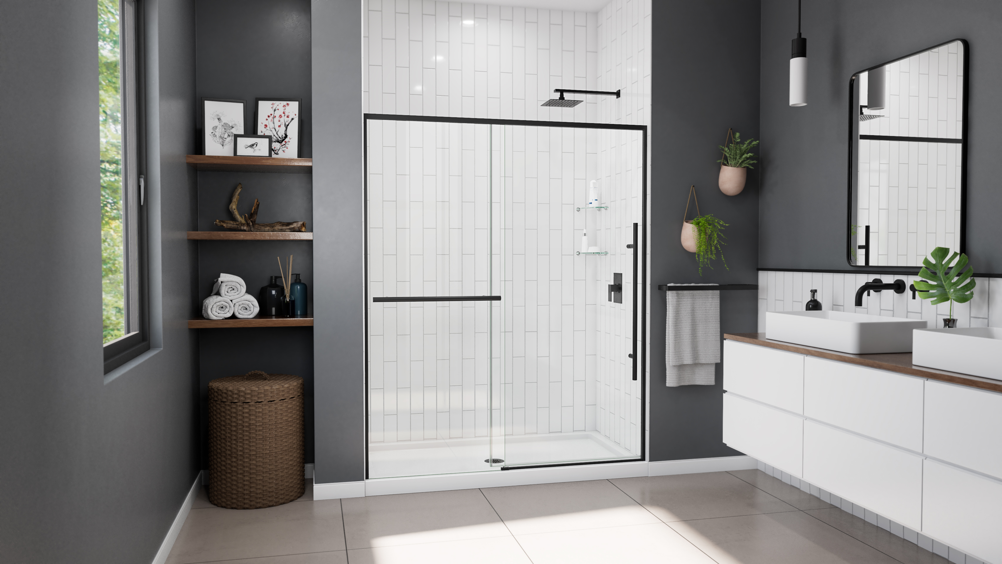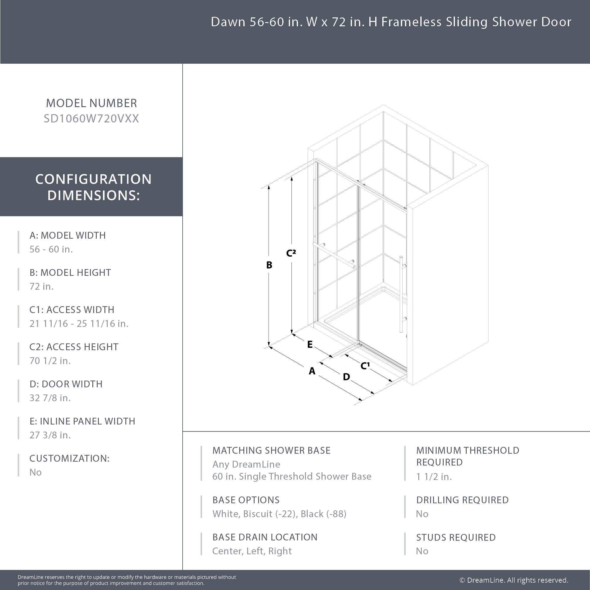 | 9 Set - Bullet 01 | Model Size: 56-60 in. W x 72 in. H; Walk-in Opening: 21 3/8 - 25 3/8 in.; Configuration consists of a Stationary Panel and Sliding Door