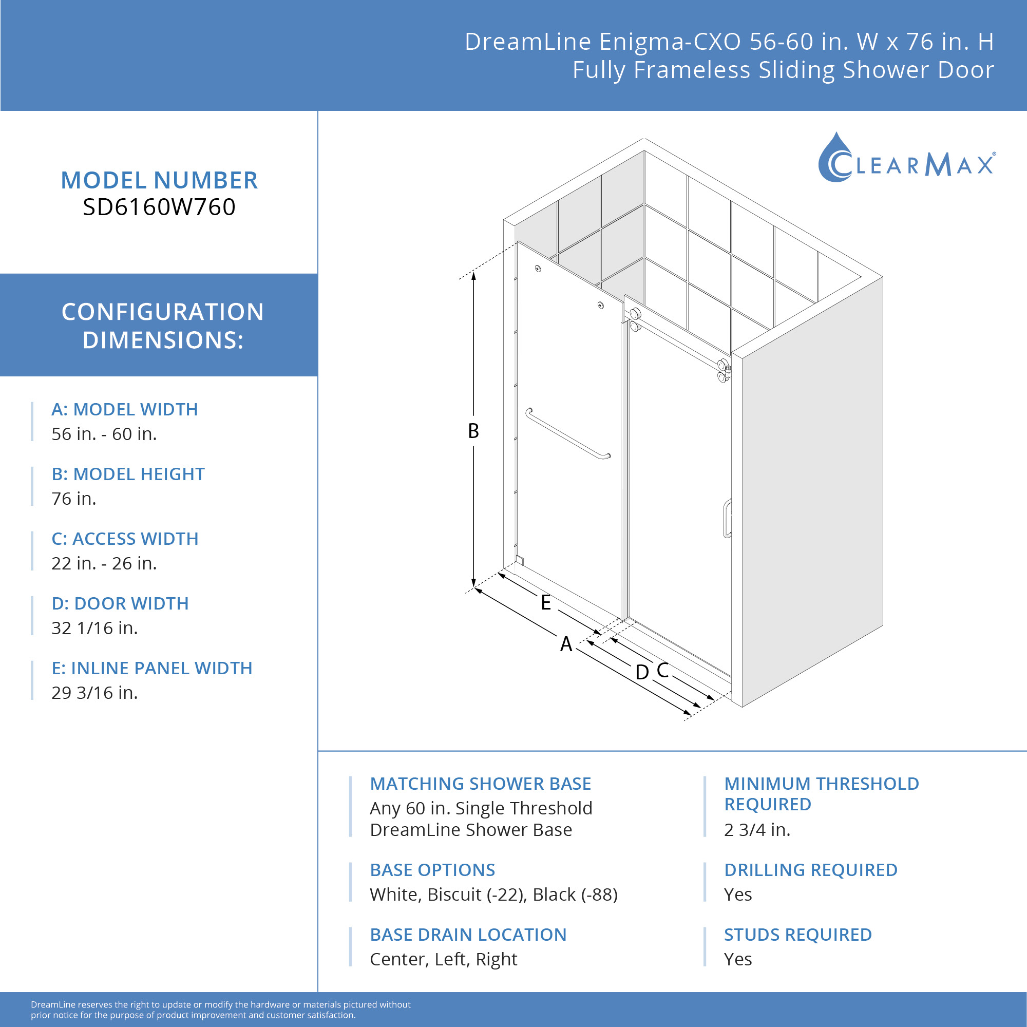 | 9 Set - Bullet 01 | Model Size: 56-60 in. W x 76 in. H; Walk-In Opening: 22-26 in. |