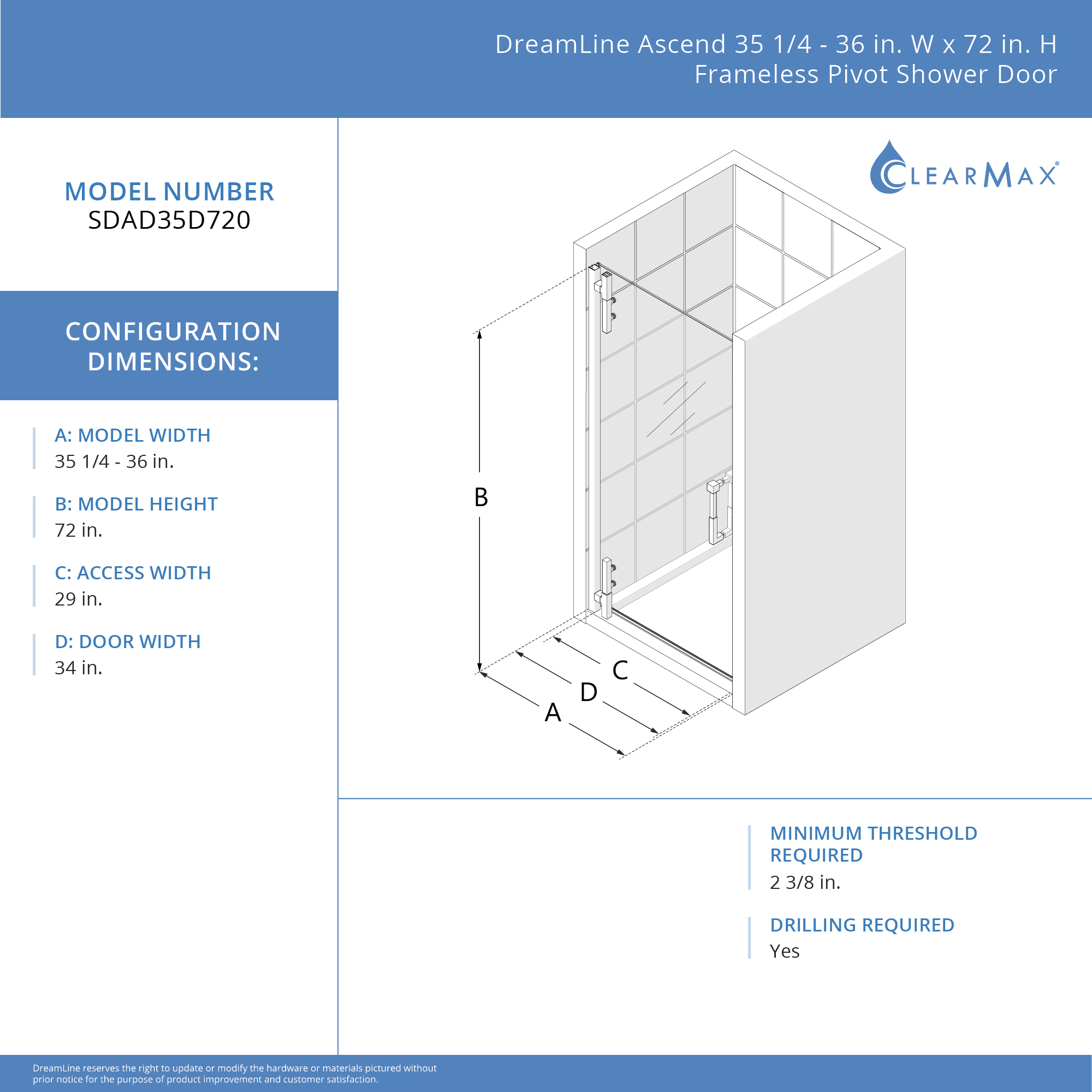 | 9 Set - Bullet 01 | Model Size: 35 1/4 - 36 in. W x 72 in. H; Walk-In Opening: 29 in. |