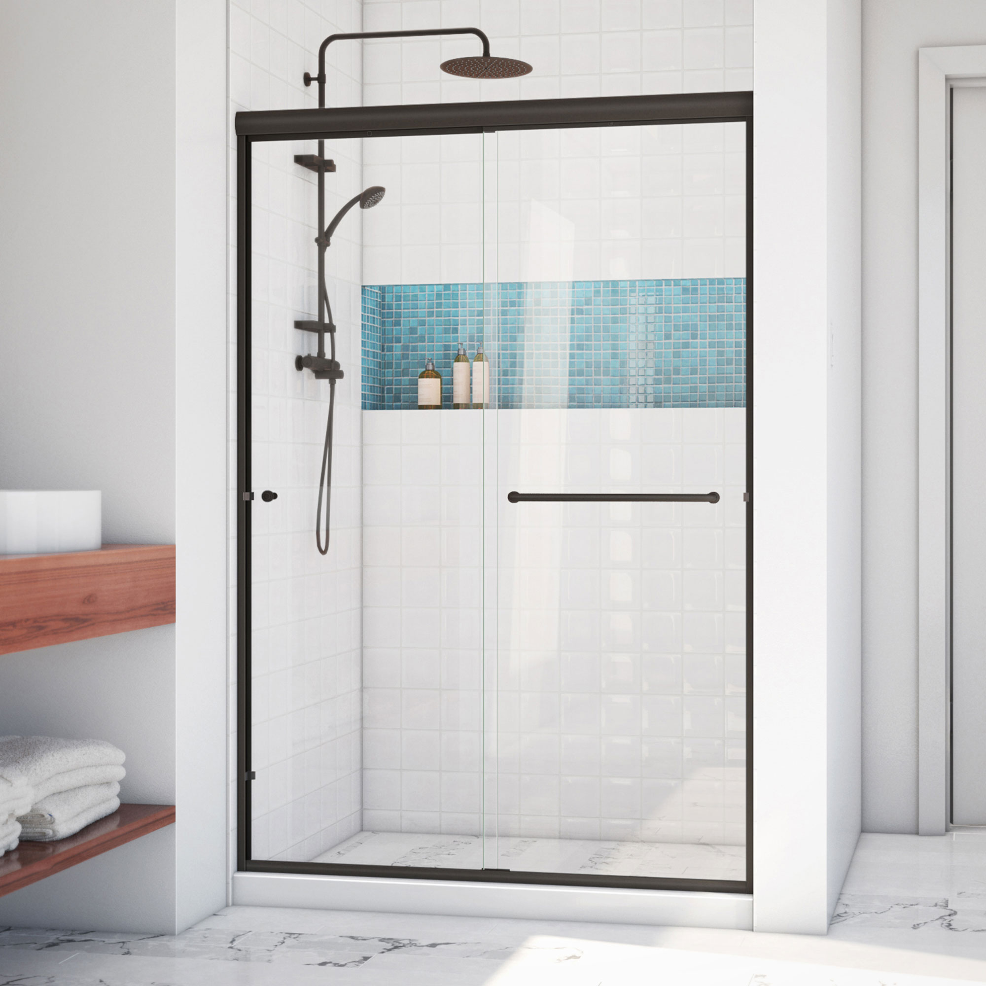 | 9 Set - Bullet 01 | Model Size: 44 - 48 in. W x 70 3/8 in. H; Walk-in Opening: 18 - 22 in.; Hardware Finish: Oil Rubbed Bronze; Glass Type: Clear |