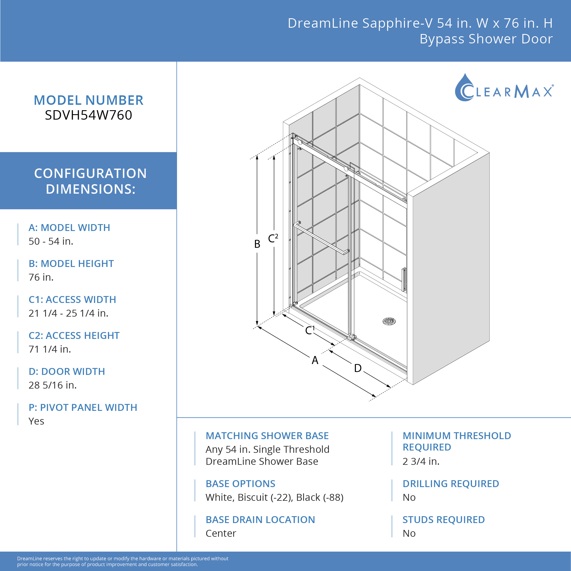 | 9 Set - Bullet 01 | Model Size: 50-54 in. W x 76 in. H; Door walk-in: 21 1/4 - 25 1/4 in.; Double sliding bypass configuration for left or right side entry to the shower |