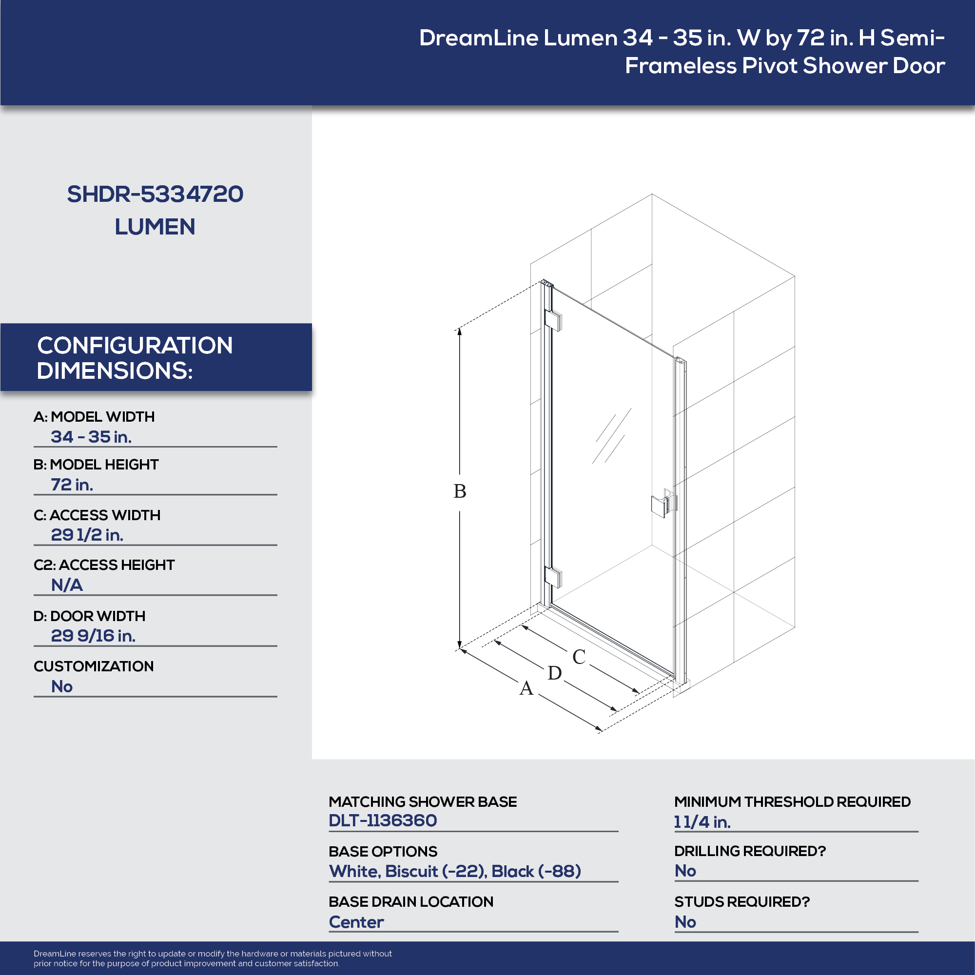 | 9 Set - Bullet 01 | Model Size: 34-35 in. W x 72 in. H; Walk-in Opening: 29 1/2 in.; Configuration: Single panel swing shower door |