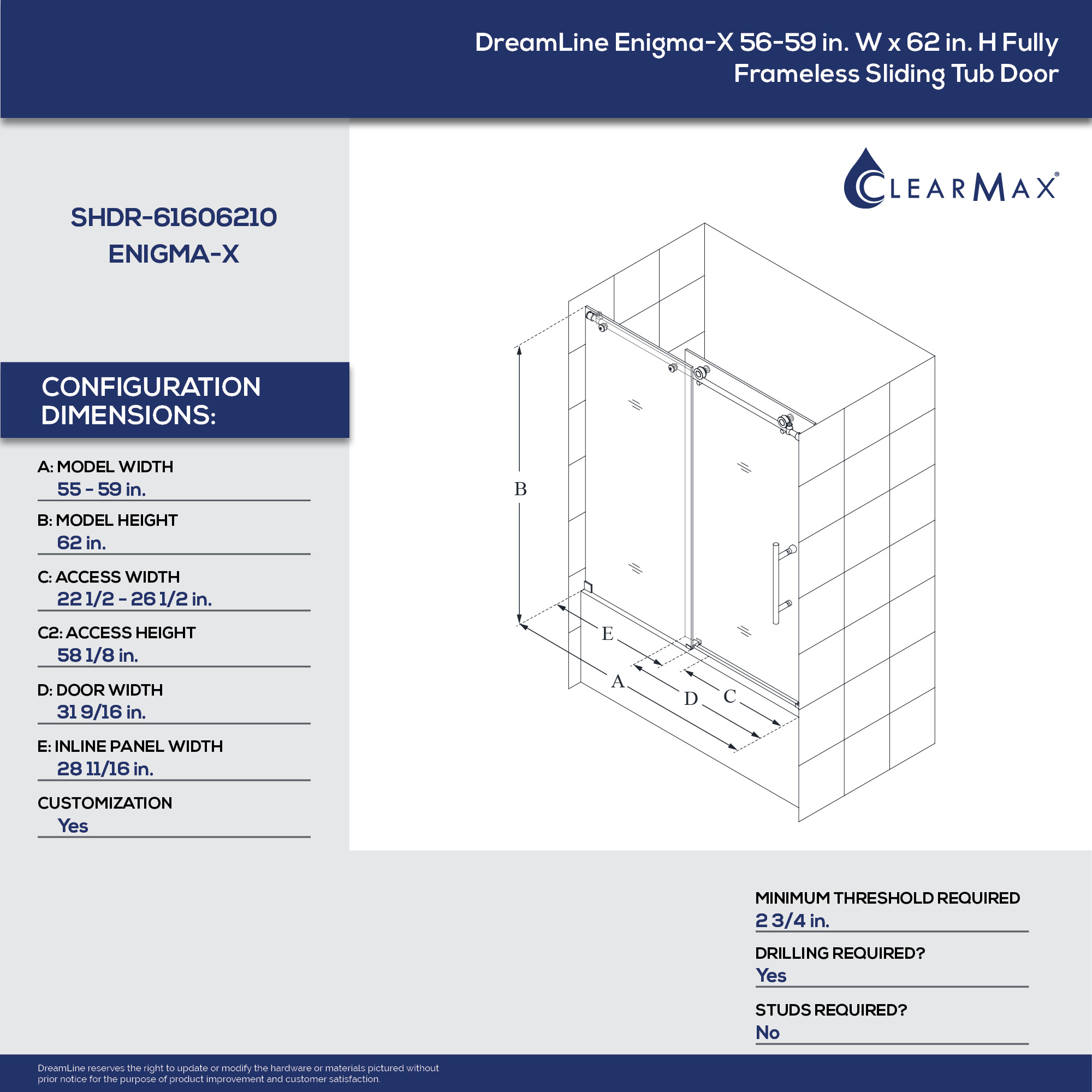 | 9 Set - Bullet 01 | Model Size: 55-59 in. W x 62 in. H; Walk-In Opening: 22 1/2 - 26 1/2 in. |