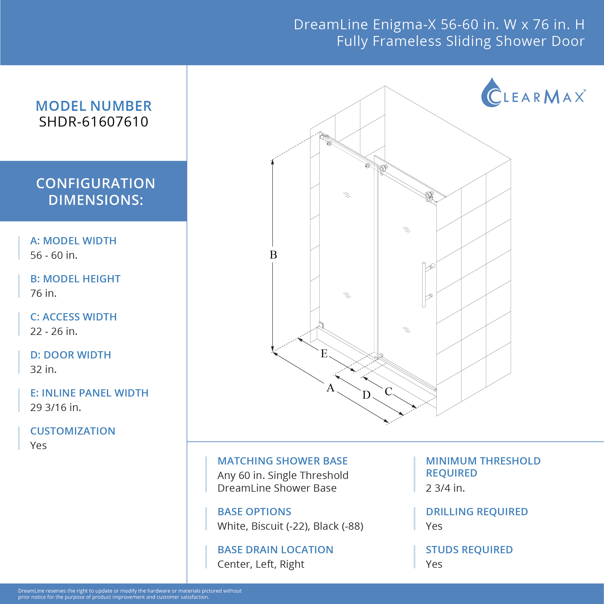 | 9 Set - Bullet 01 | Model Size: 56-60 in. W x 76 in. H; Walk-In Opening: 22-26 in. |