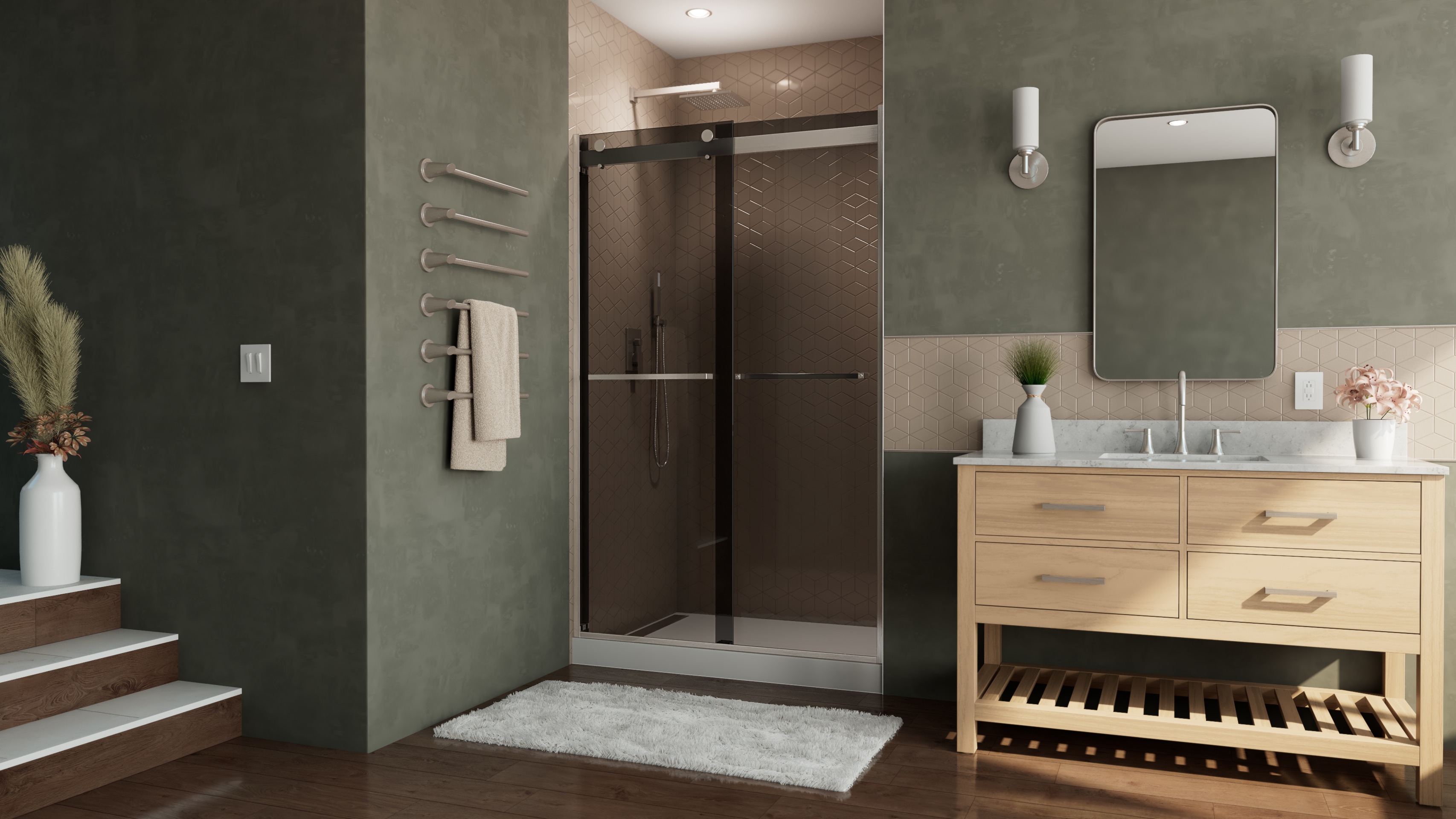 | 9 Set - Bullet 02 | Quality 5/16 in. (8 mm) thick certified smoke gray tempered glass; DreamLine exclusive ClearMax water and stain resistant glass coating |