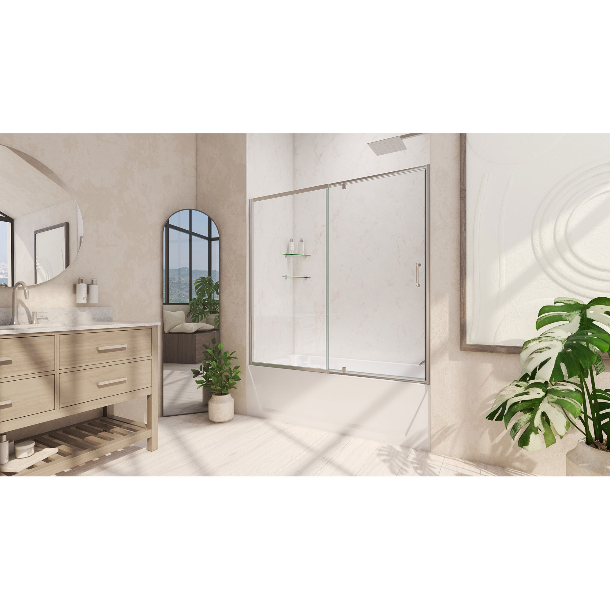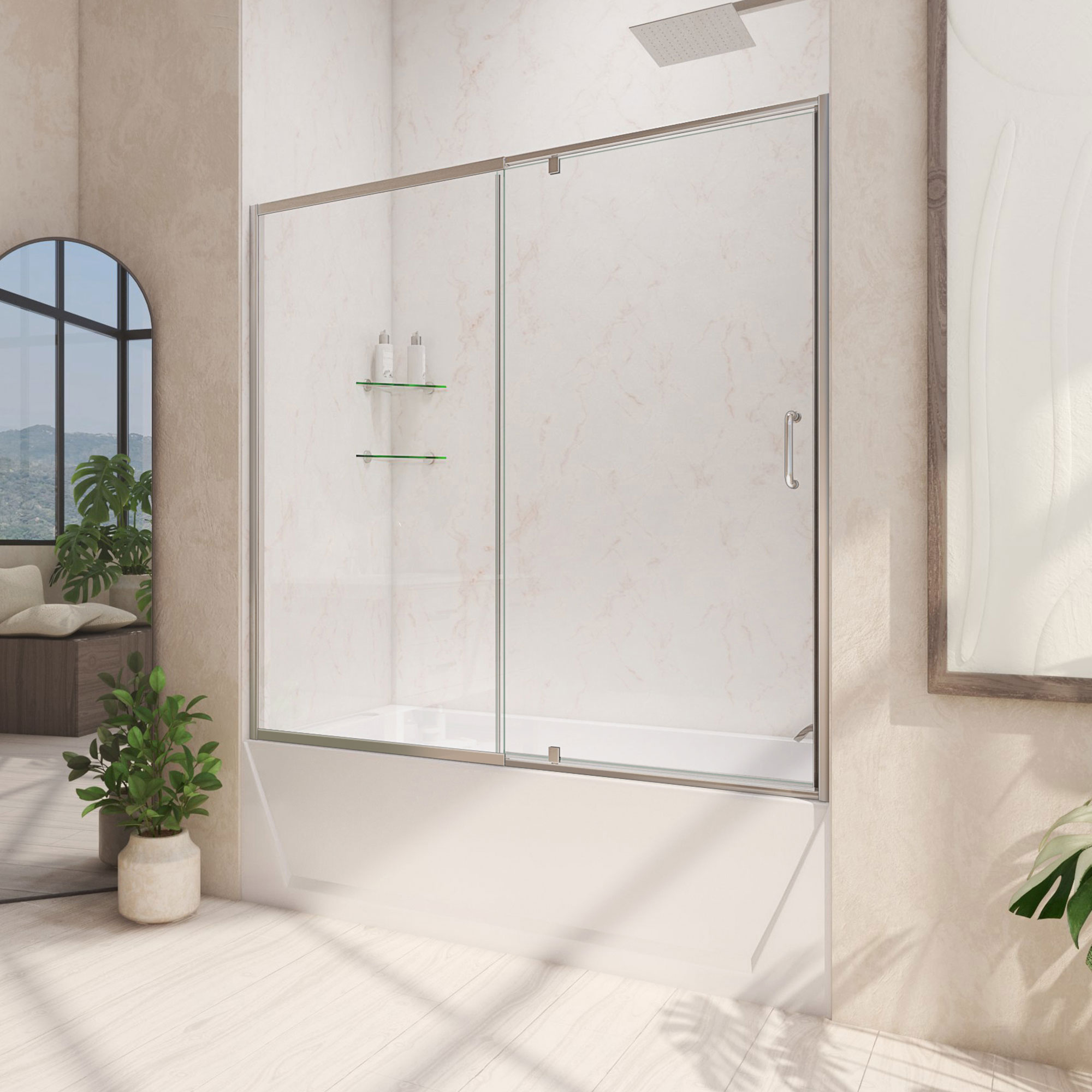 | 9 Set - Bullet 01 | Model Size: 56-60 in. W x 58 in. H; Walk-in Opening: 22 7/8 in.; Hardware Finish: Brushed Nickel |