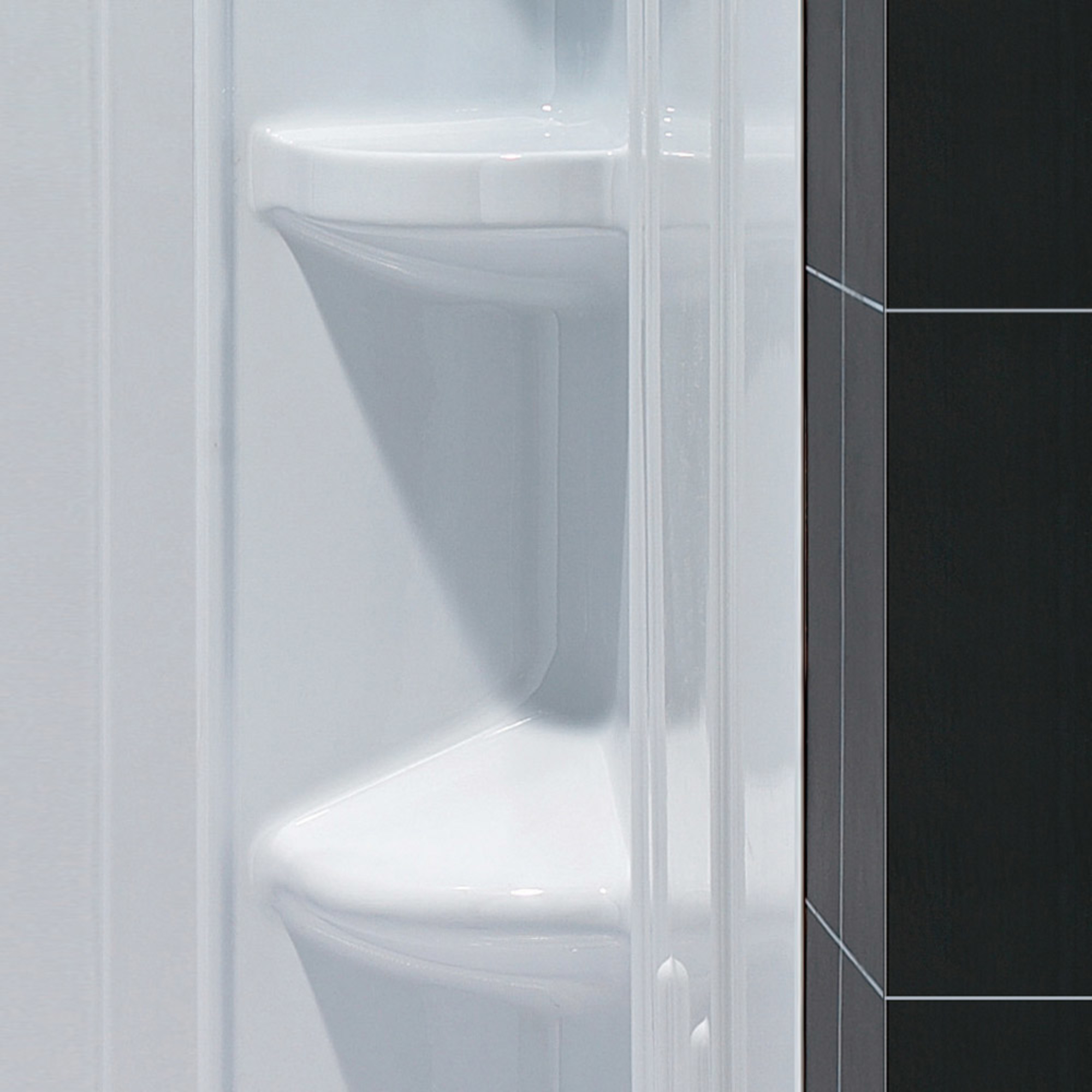 | 9 Set - Bullet 07 | Q-Wall Backwall: Panels can be glued to existing surfaces; 3 integrated shelves and a corner footrest; Attractive tile pattern; Acrylic/ABS material |