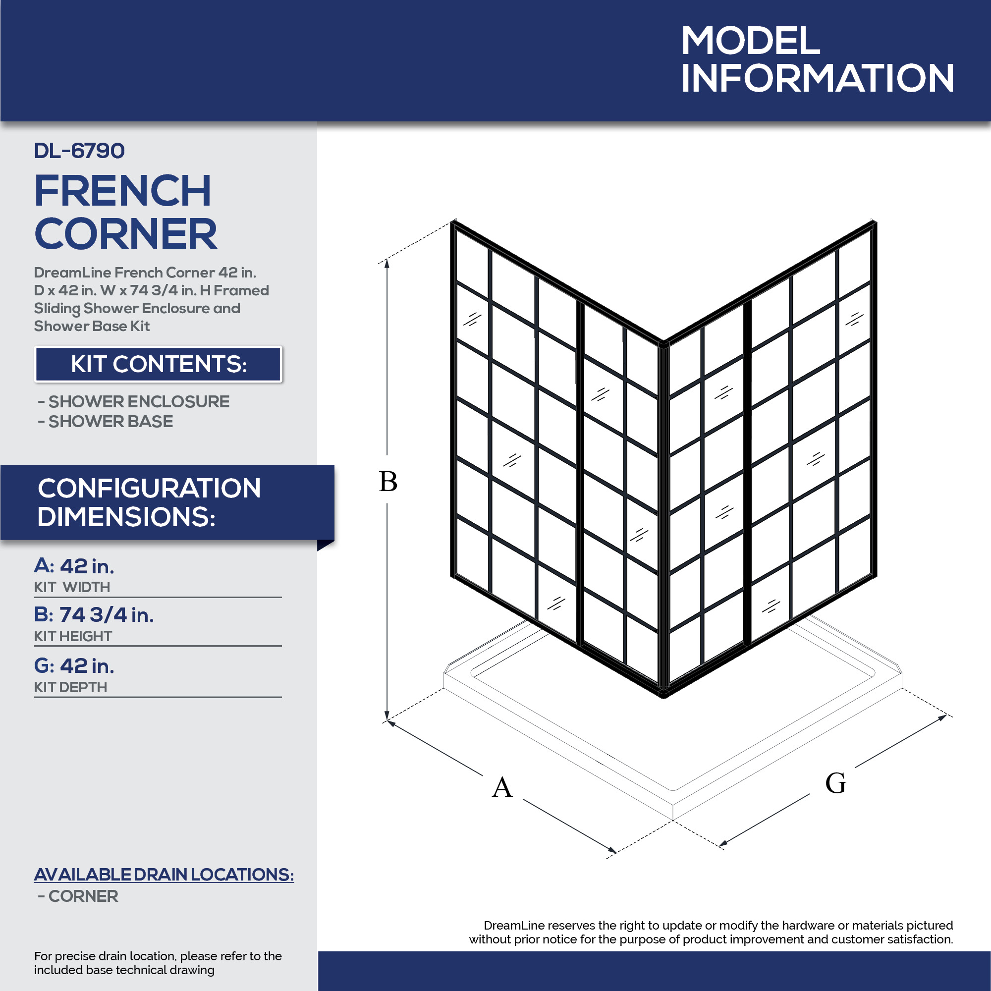 | Product Name | DreamLine French Corner 42 inch D x 42 inch W x 74 3/4 inch H Framed Sliding Shower Enclosure in Matte Black and Black Shower Base Kit |