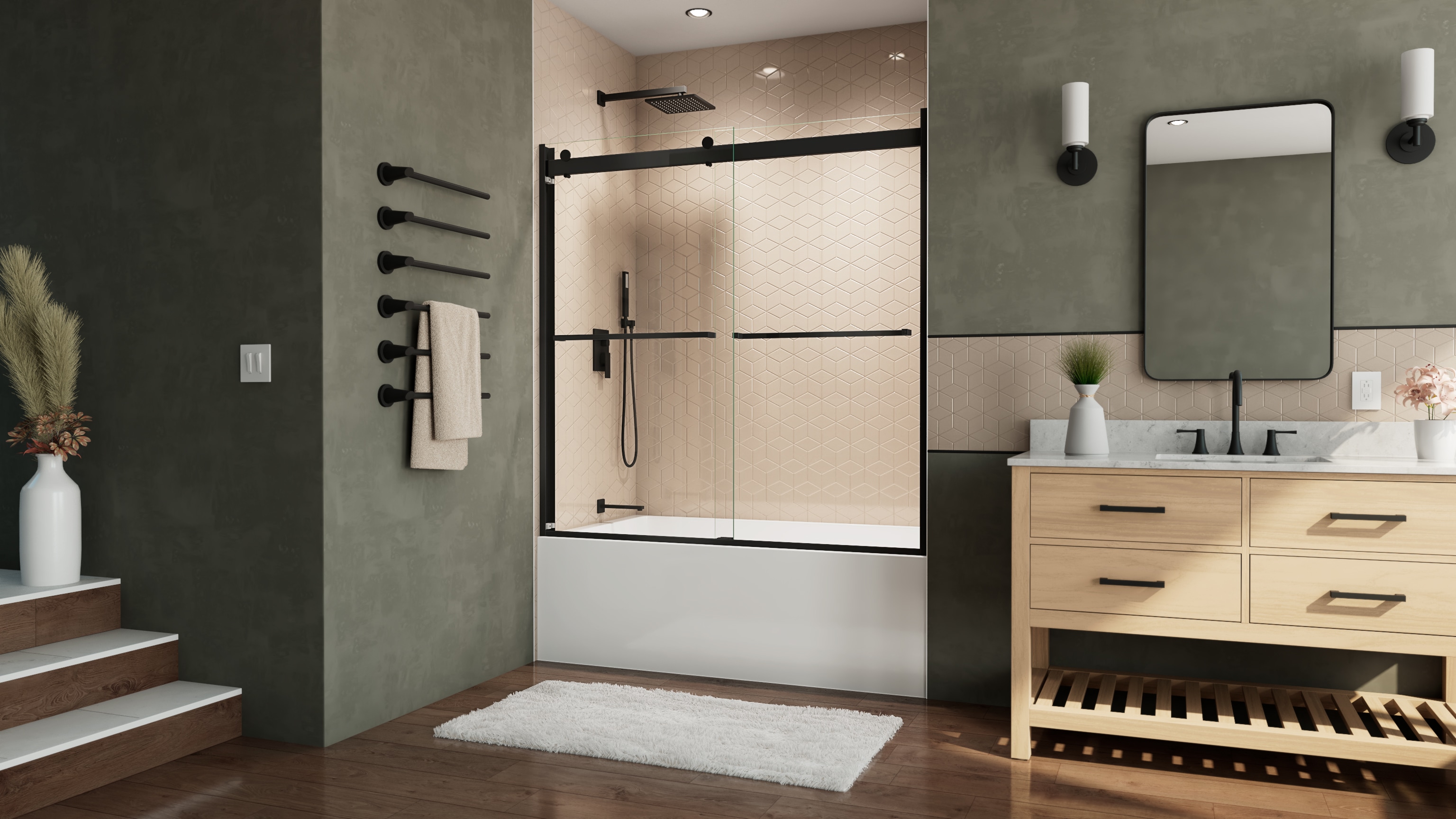| 9 Set - Bullet 01 | Model Size: 56-60 in. W x 60 in. H; Door walk-in: 23 1/4 - 27 1/4 in.; Double sliding bypass configuration allows entry from left or right side |