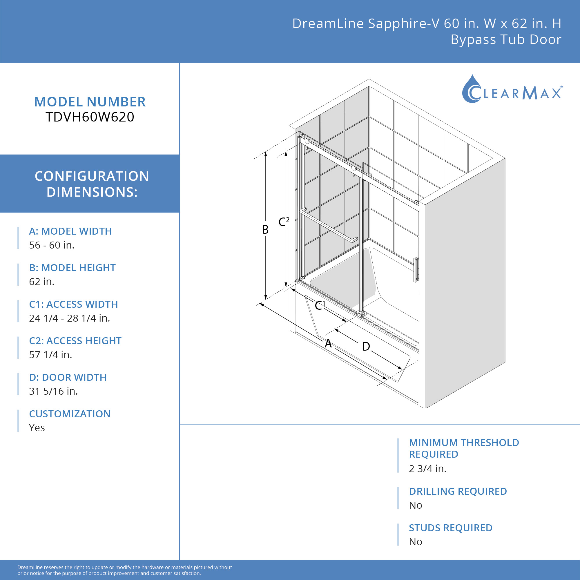 | 9 Set - Bullet 01 | Model Size: 56-60 in. W x 62 in. H; Door walk-in: 24 1/4 - 28 1/4 in.; Double sliding bypass configuration for left or right side entry to the shower |