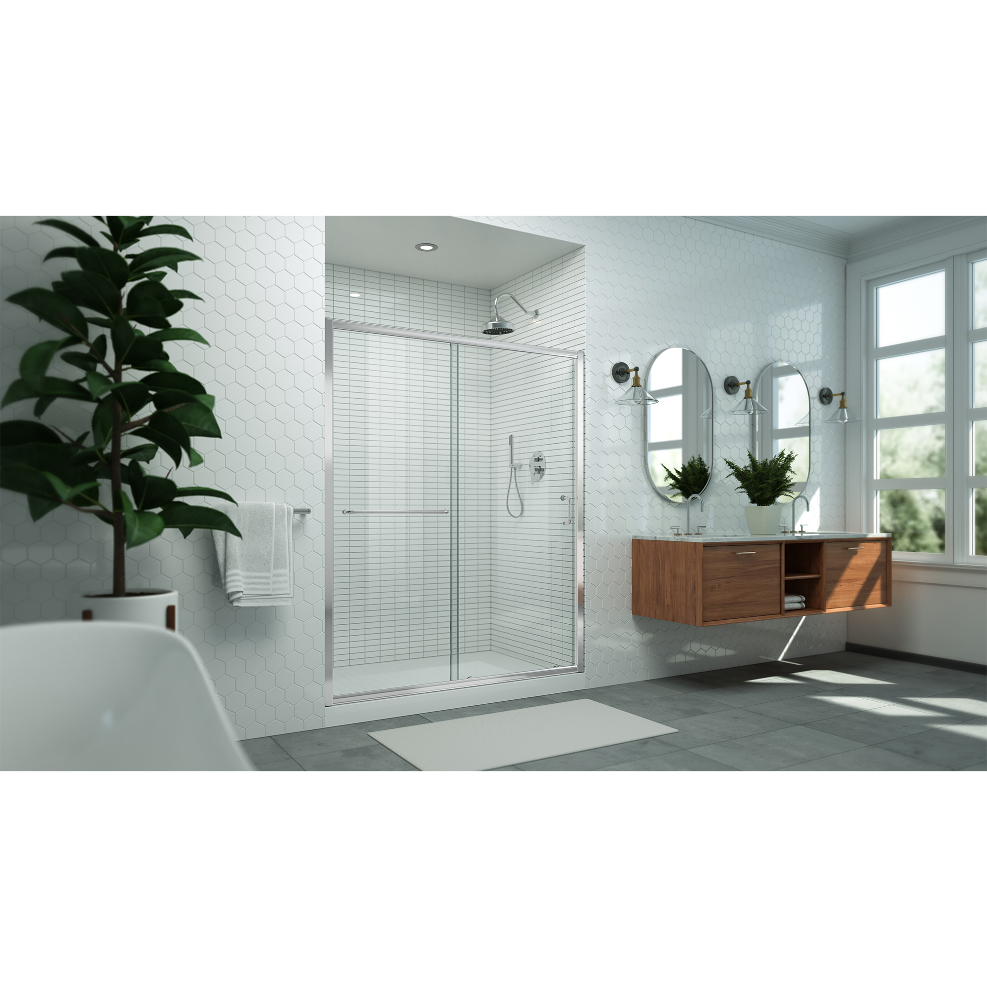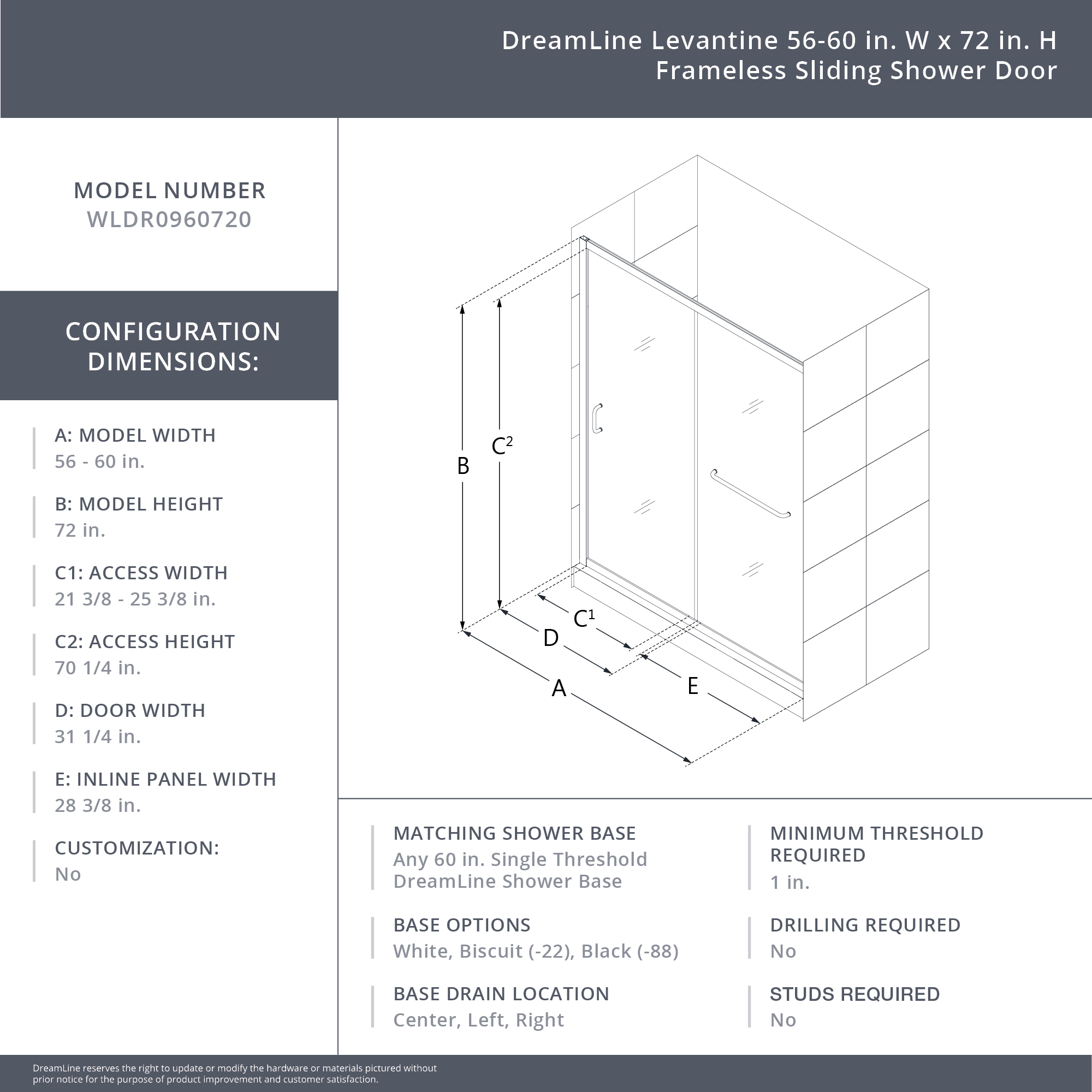| 9 Set - Bullet 01 | Model Size: 56 - 60 in. W x 72 in. H; Walk-in Opening: 21 3/8 - 25 3/8 in.; Configuration consists of a Stationary Panel and Sliding Door |