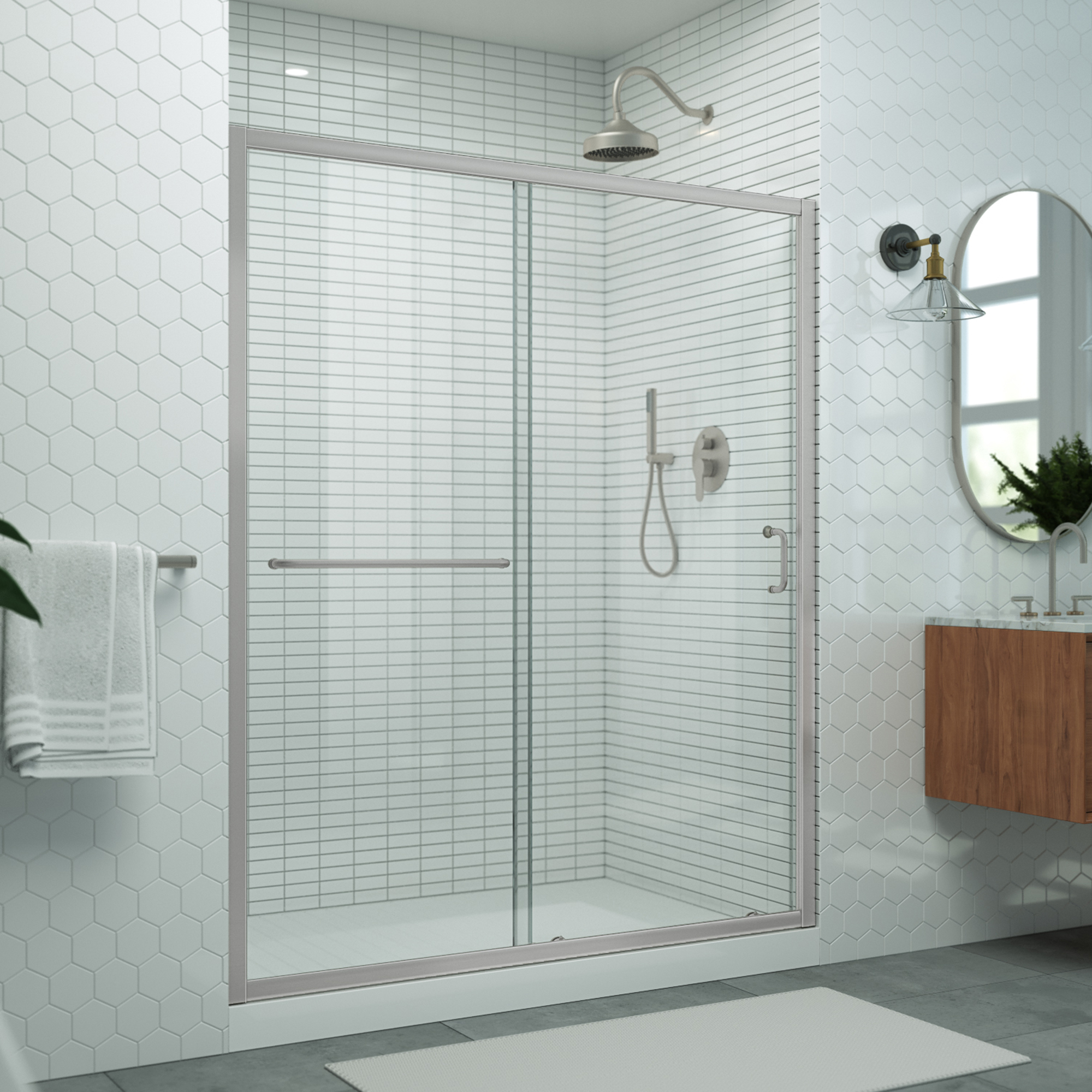 | 9 Set - Bullet 01 | Model Size: 56 - 60 in. W x 72 in. H; Walk-in Opening: 21 3/8 - 25 3/8 in.; Configuration consists of a Stationary Panel and Sliding Door |