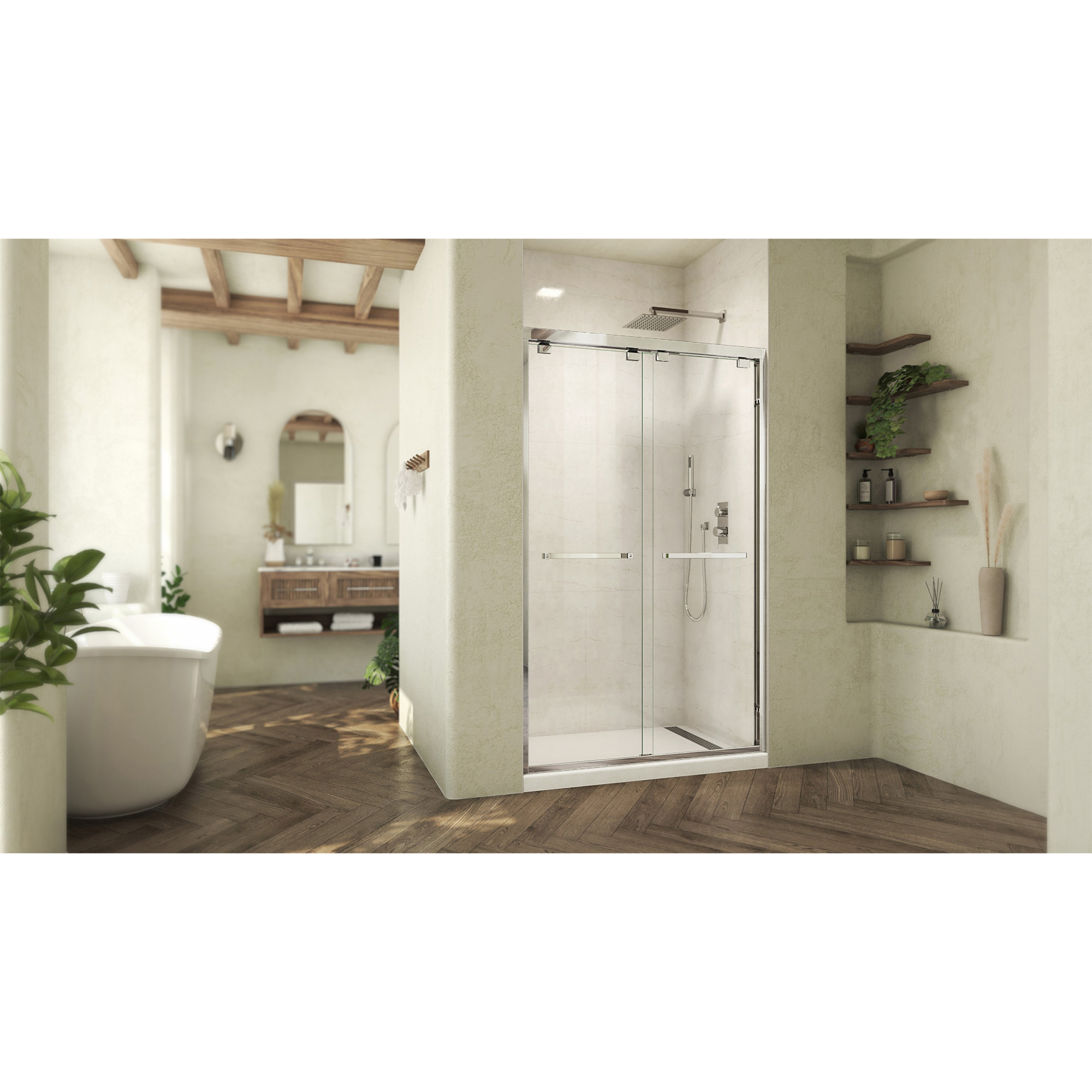 | 9 Set - Bullet 02 | Configuration: Double sliding bypass design allows entry to the shower from left or right side; Frameless glass design creates an open, airy feel |
