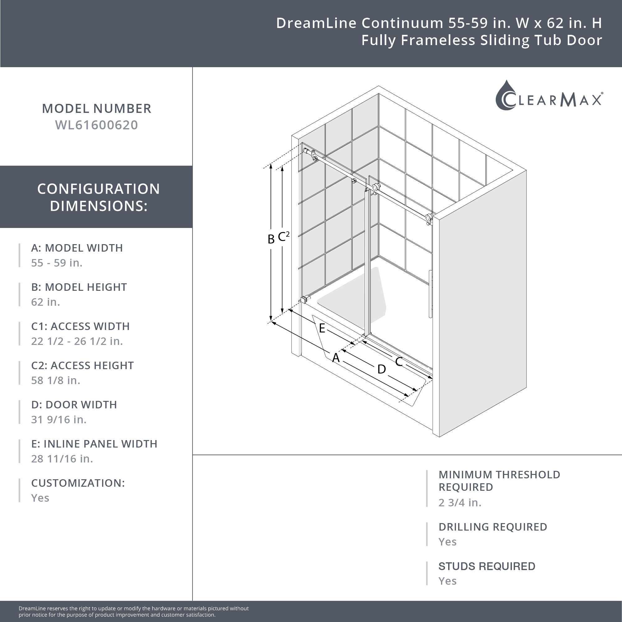 | 9 Set - Bullet 01 | Model Size: 55-59 in. W x 62 in. H; Walk-In Opening: 22 1/2 - 26 1/2 in. |