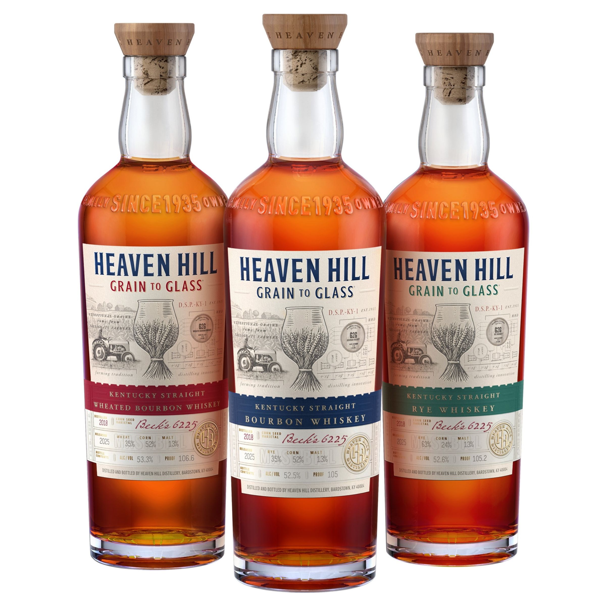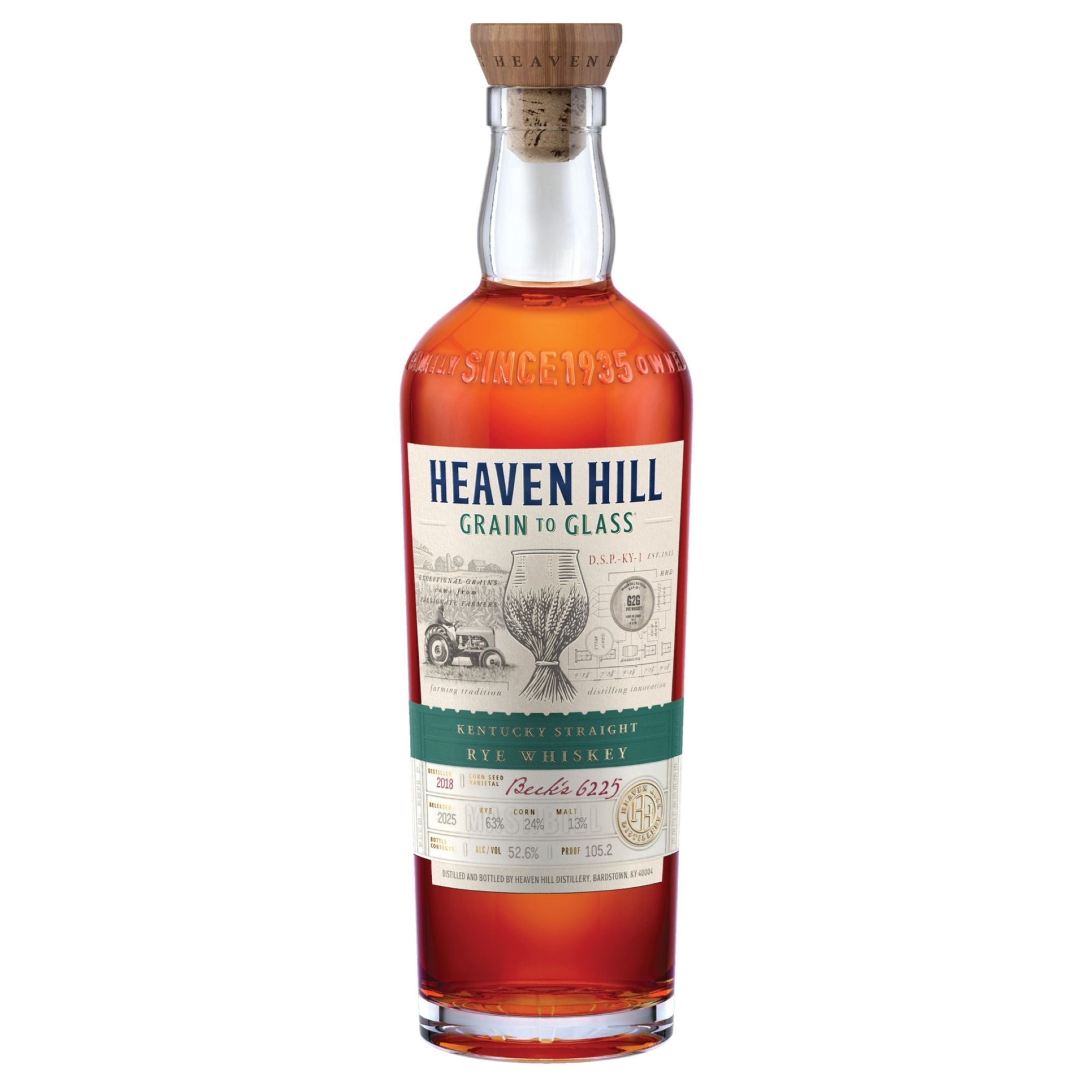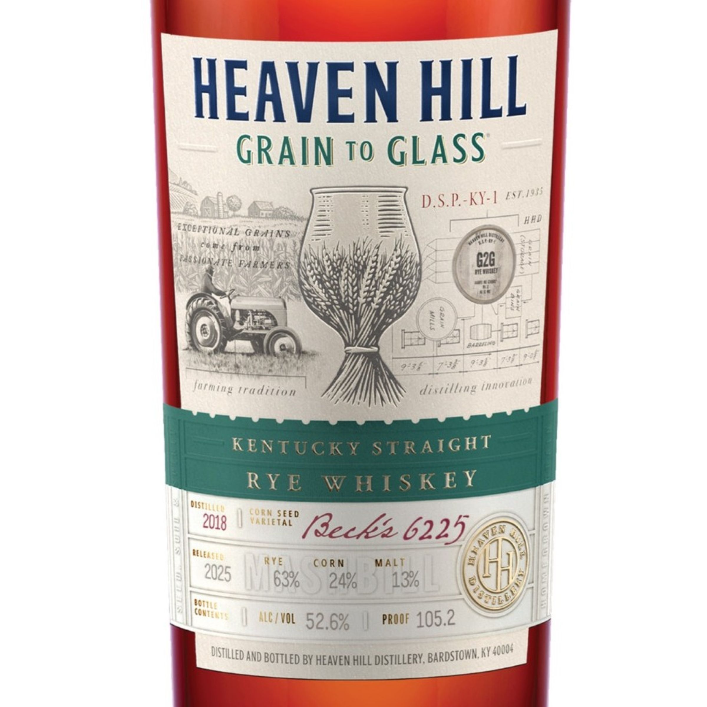 | Brand Story | Since 1935, Heaven Hill Distillery has been dedicated to crafting the highest quality Kentucky Whiskeys. This led us to start at the very beginning - the seed. Each year, our Master Distiller partners with fellow family-owned seed company Beck's Hybrids to hand-select a unique corn seed varietal that best grows in Kentucky. Beck's 6225 was the corn seed varietal chosen for our 2nd edition to grow well in the soils of Central Kentucky. The corn and wheat were grown by family-owned Peterson Farms on one of two sites in Nelson County, Kentucky. The 2nd Edition of the Heaven Hill Grain to Glass Kentucky Straight Rye Whiskey features a mashbill with higher Rye content than our traditional Rye mashbill. The distillate went into the barrel at 107 proof, has been aged over six years at our Cox's Creek rickhouse site, non-chill filtered and bottled at barrel proof, 105.2 proof. |