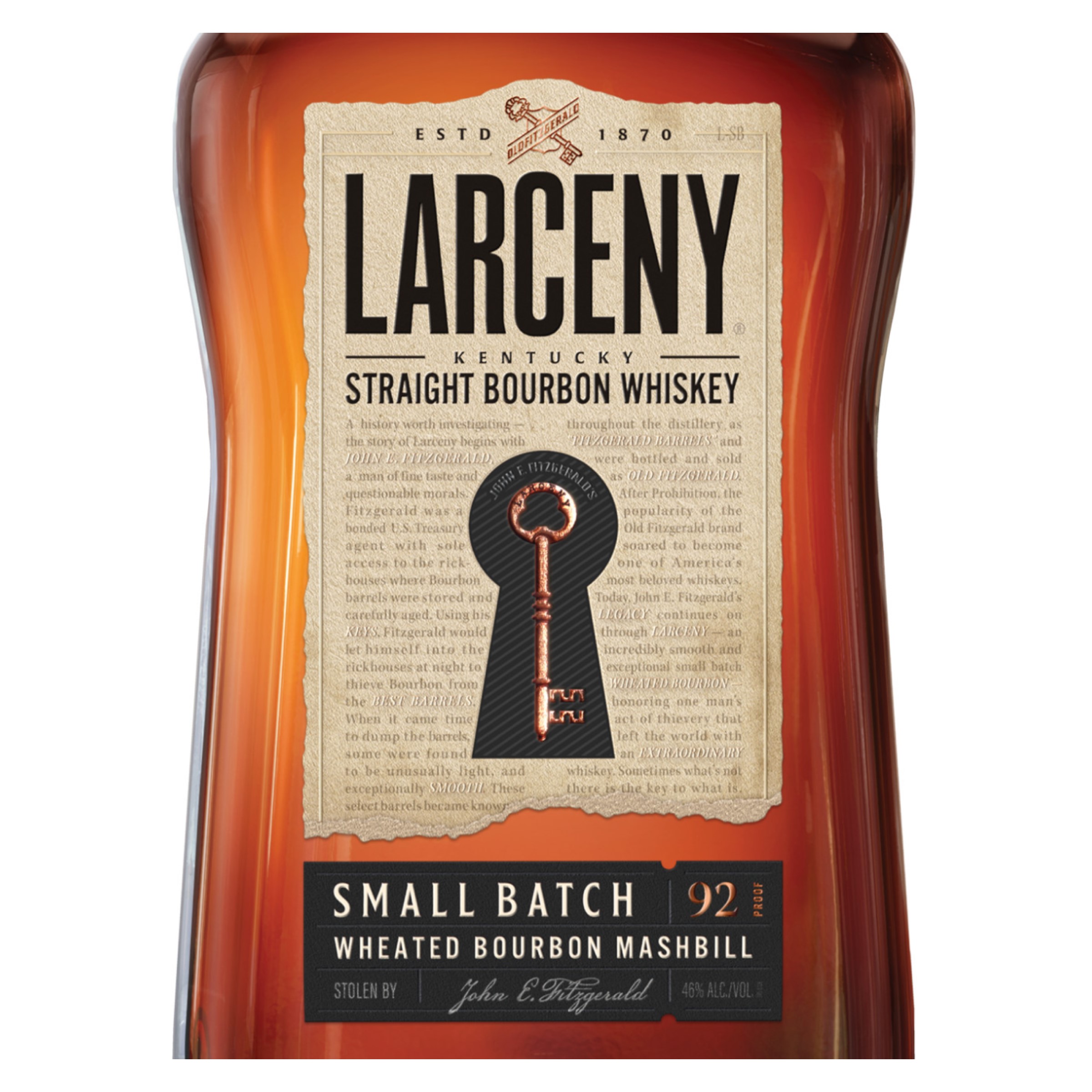 | Long Description | Unlock the smooth taste of Larceny Small Batch Bourbon. Larceny is rooted in the history of John E. Fitzgerald and the Old Fitzgerald brand. Continuing the tradition of Old Fitzgerald, Larceny is made with wheat instead of rye as the secondary grain, delivering a smooth taste that’s hard to resist. It is one of only a handful of Wheated Bourbons that exist, and has 25% more wheat than the leading competitor. Along with its wheated profile, Larceny Small Batch is bottled at 92 proof, making it ideal for enjoying neat, on the rocks, or in a cocktail like the Kentucky Mule. Larceny Bourbon features aromas of fresh bread and toffee with a note of butterscotch, a taste profile of buttery caramel and honey, and a long, gently sweet and savory finish. This Bourbon has won numerous awards from prestigious tasting competitions, including Double Gold and at the 2024 San Francisco World Spirits Competition, Double Platinum at the 2024 ASCOT Awards, and Double Gold at the 2024 TAG Global Spirits Awards. Try the award winning taste of Larceny and unlock our wheated difference. |