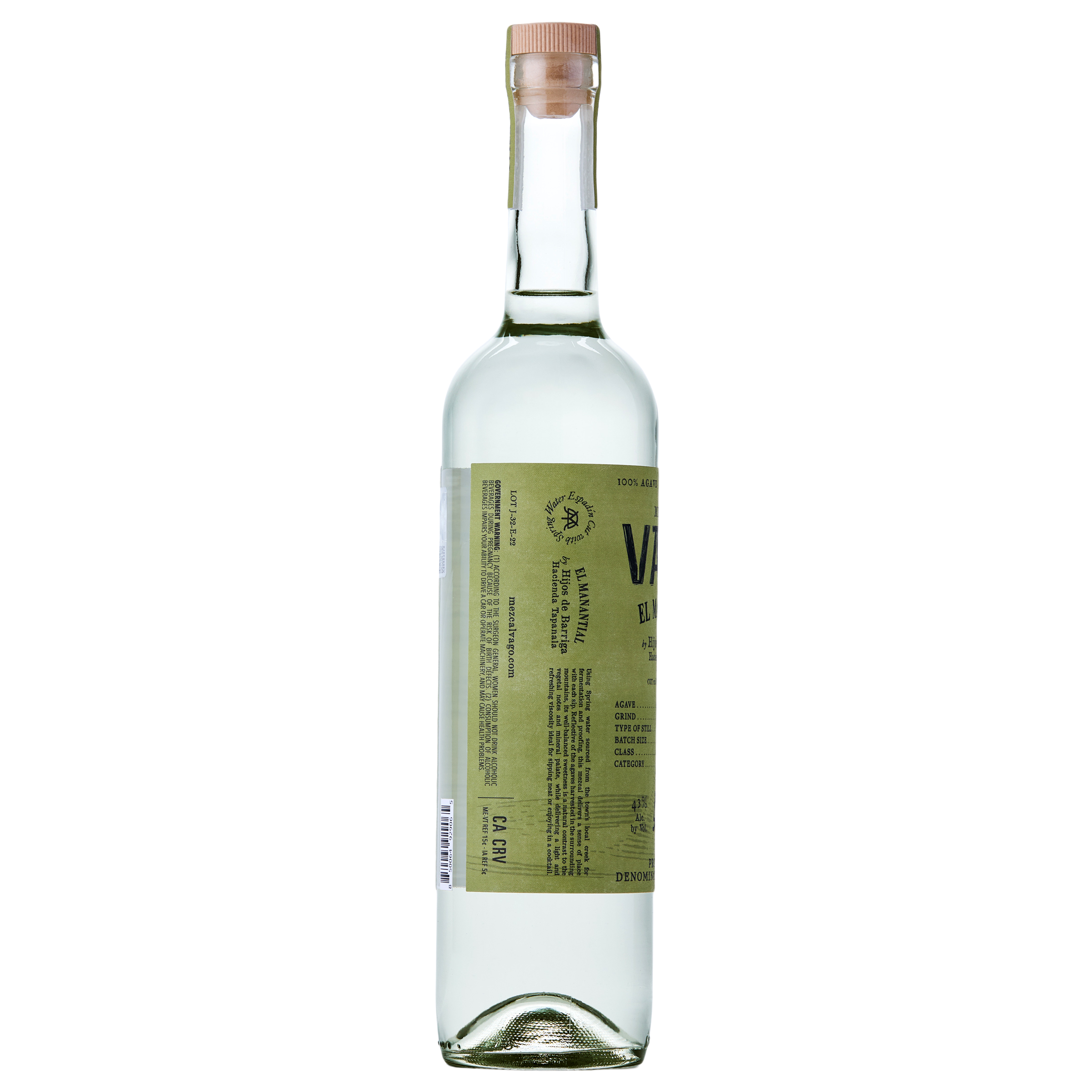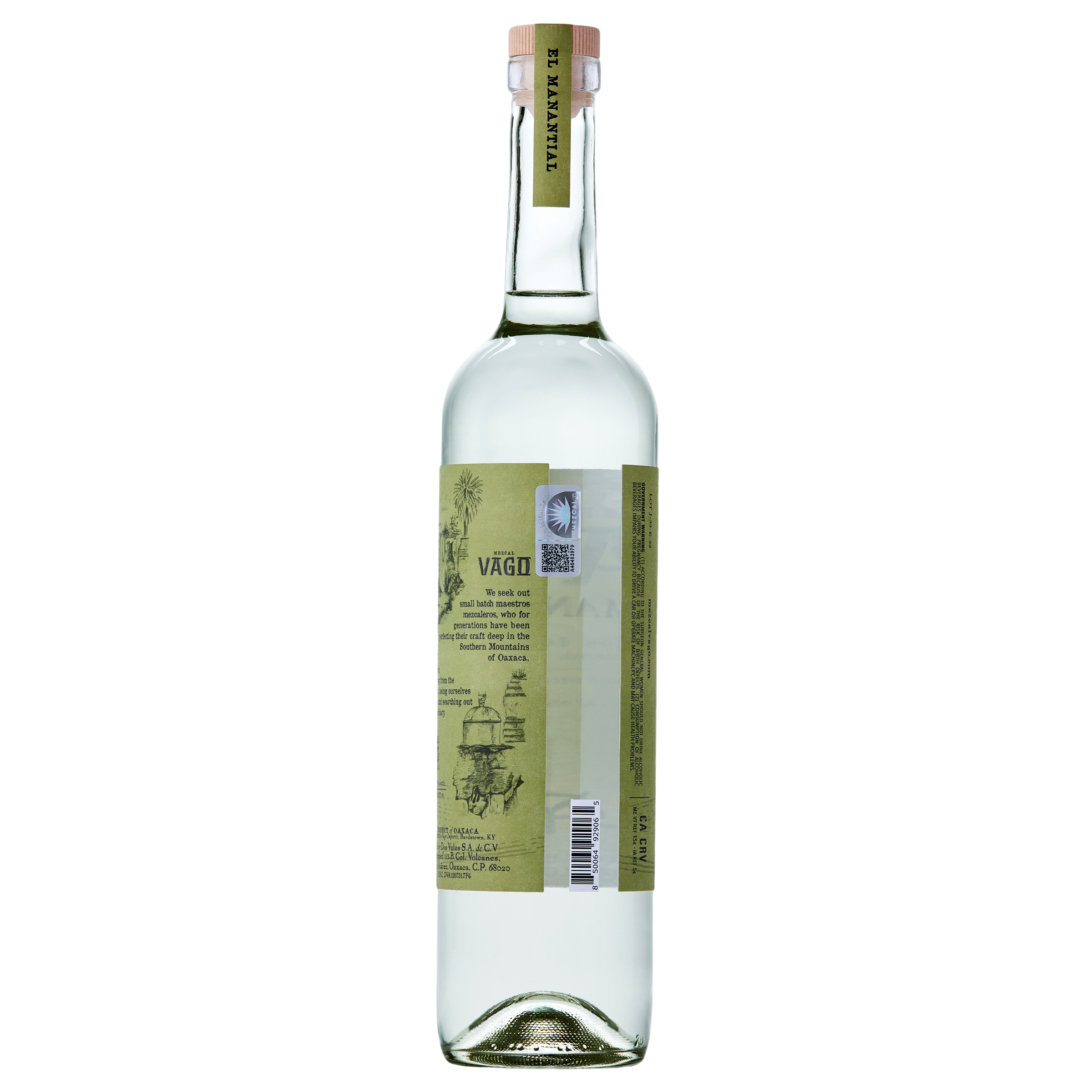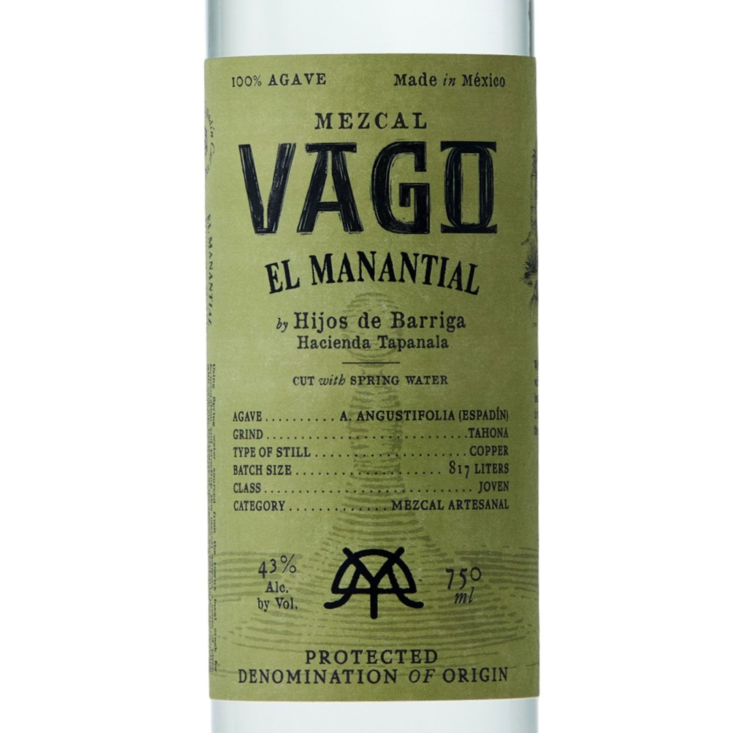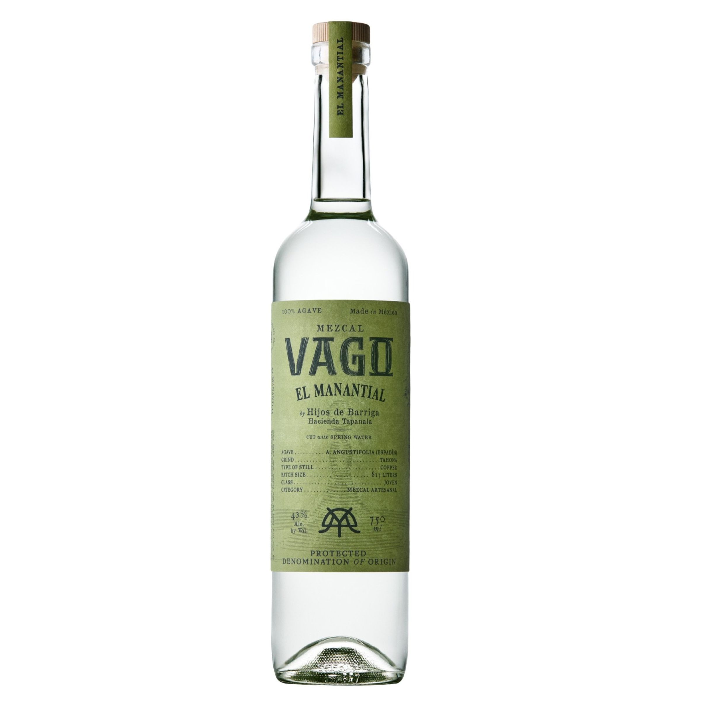 | Long Description | Mezcal Vago's El Manantial is an approachable, artisanal mezcal for both longtime fans and newcomers. This 43% ABV Espadín is crafted in Tapanala, Oaxaca, on a high plateau in the Sierra Sur mountains. Fermented and proofed with nearby spring water that supports the community, it offers a deepened sense of terroir in each pour. This expression, made by the sons of Joel Barriga, carries the bright agave and fruit-forward, almost tropical profile his mezcals are known for. In addition to a sessionable sip, this expression is perfect for artisanal mezcal cocktailing.