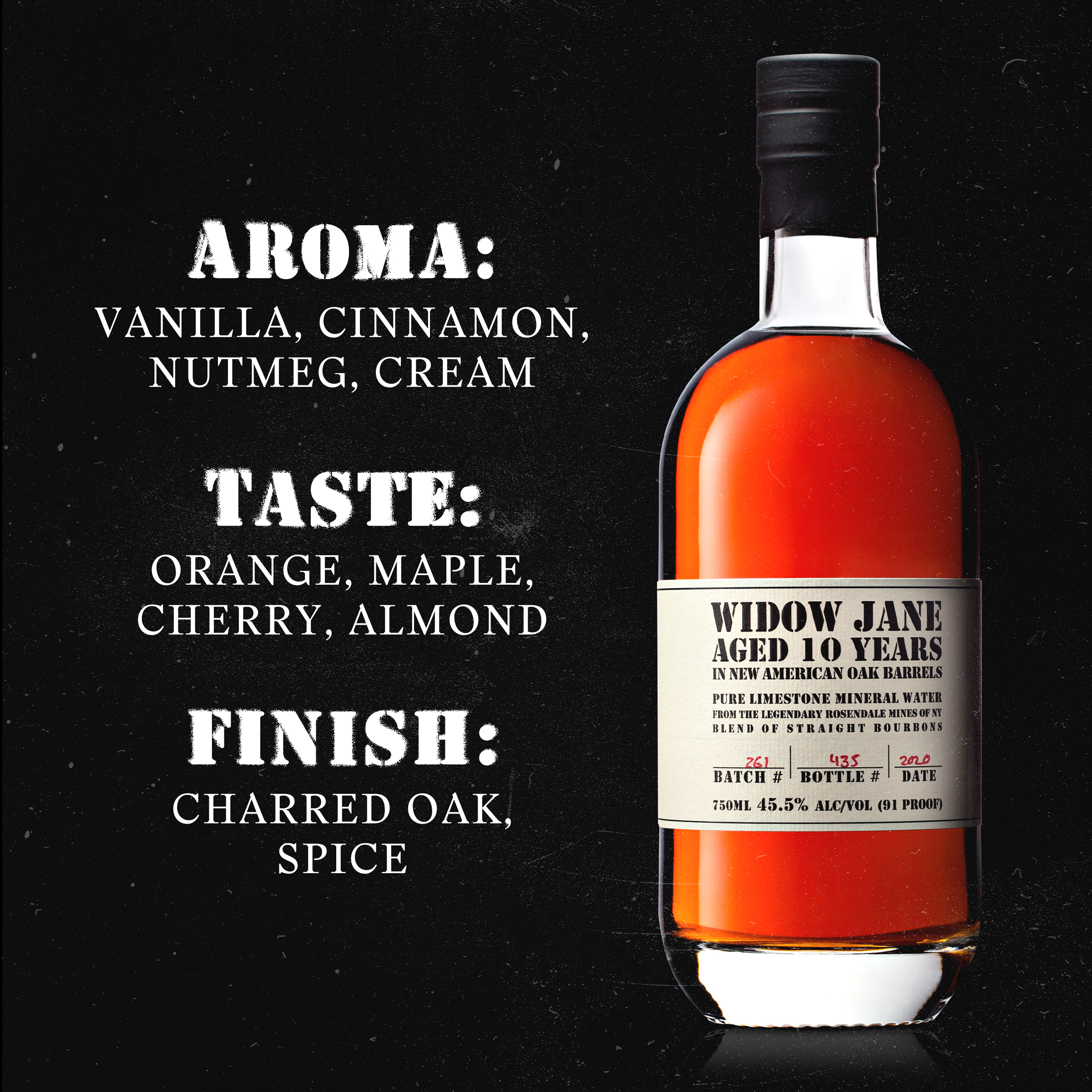 | Long Description | Aged 10 years. Reviving the lost art of marrying the finest whiskeys, Widow Jane 10-Year-Old is our signature bourbon. Hand-assembled in Brooklyn, NY using the richest and rarest straight bourbons from their ancestral homes of Kentucky, Indiana, and Tennessee, blended together only in 5-barrel batches, non-chill filtered, & proofed down with our own hard-yet-sweet mineral water from the legendary Rosendale limestone mines from Hudson Valley, NY, we deliver a whiskey unique in its intensity & complexity. This water is our fingerprint and signature ingredient in all Widow Jane whiskeys.