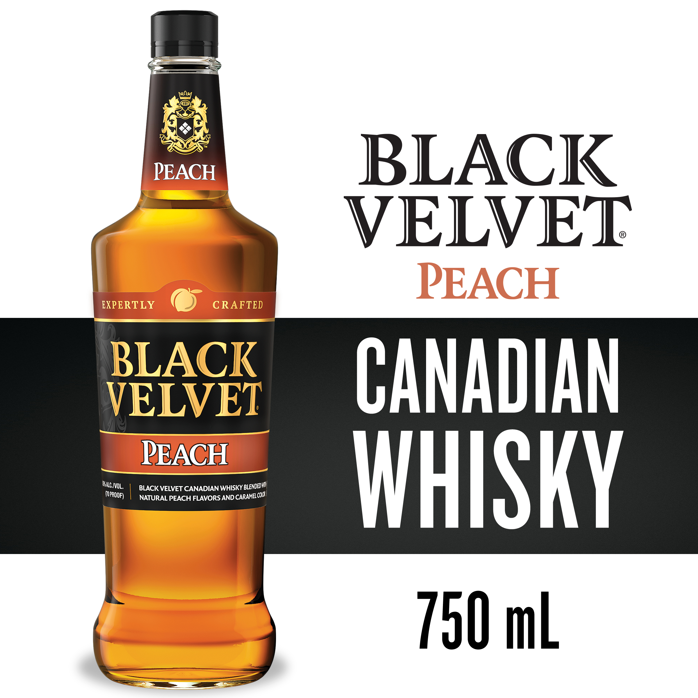 | Long Description | Black Velvet Peach is the perfect blend of original Black Velvet Canadian Whisky and natural peach flavors. At 70 proof, it delivers a smooth, balanced, and distinctly delicious peach taste with a fresh, sweet finish. Enjoy Black Velvet Peach neat, on the rocks, with a mixer, or in a delicious cocktail. Black Velvet first came out of the barrel in 1951 and has grown to become the second largest Canadian Whisky in the world. The brand was initially known as “Black Label,” but after Jack Napier, the original distiller, sampled the first batch, he changed the name to Black Velvet to reflect its uncommon velvety taste and smoothness. Using crystal clear Canadian water, plus the finest rye, grains, and corn, the whisky is painstakingly distilled, Blended at Birth™, and put up in premium oak barrels to gently mature. |