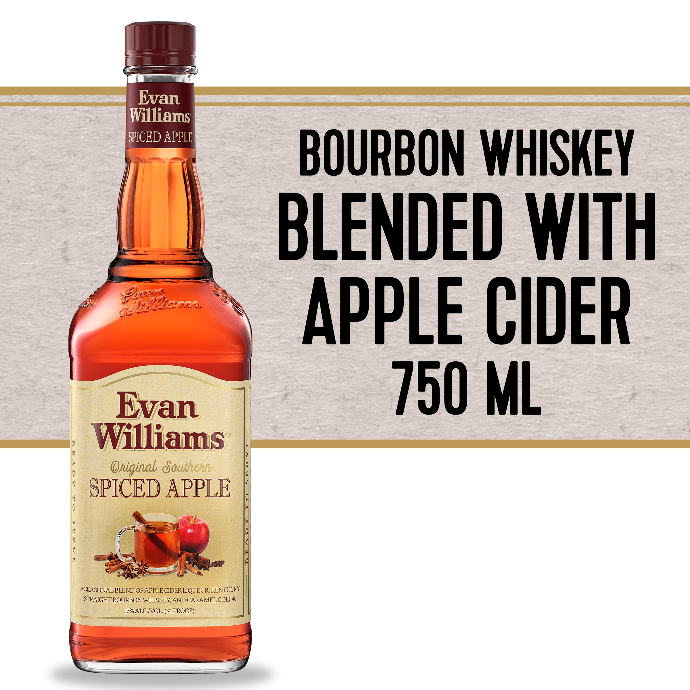 | Long Description | Spice up your fall. Our bourbon knows how to pick an apple. Evan Williams Original Southern Spiced Apple is the original Bourbon based apple cider. Our all-American blend of apple cider liqueur and extra-aged Bourbon Whiskey is a fall favorite. Ready to serve warm or cold, look for it in September when the weather cools. Evan Williams Original Southern Spiced Apple is pale gold in color with aromas of cinnamon, ripe fruit, and cotton candy and when warmed, has aromas of apples and graham crackers. It has a taste of sweet, soft apples with allspice and a short, sweet, and mouth coating finish. When warmed, it tastes of baked apples and nutmeg with a longer finish with citrus and cobbler. |