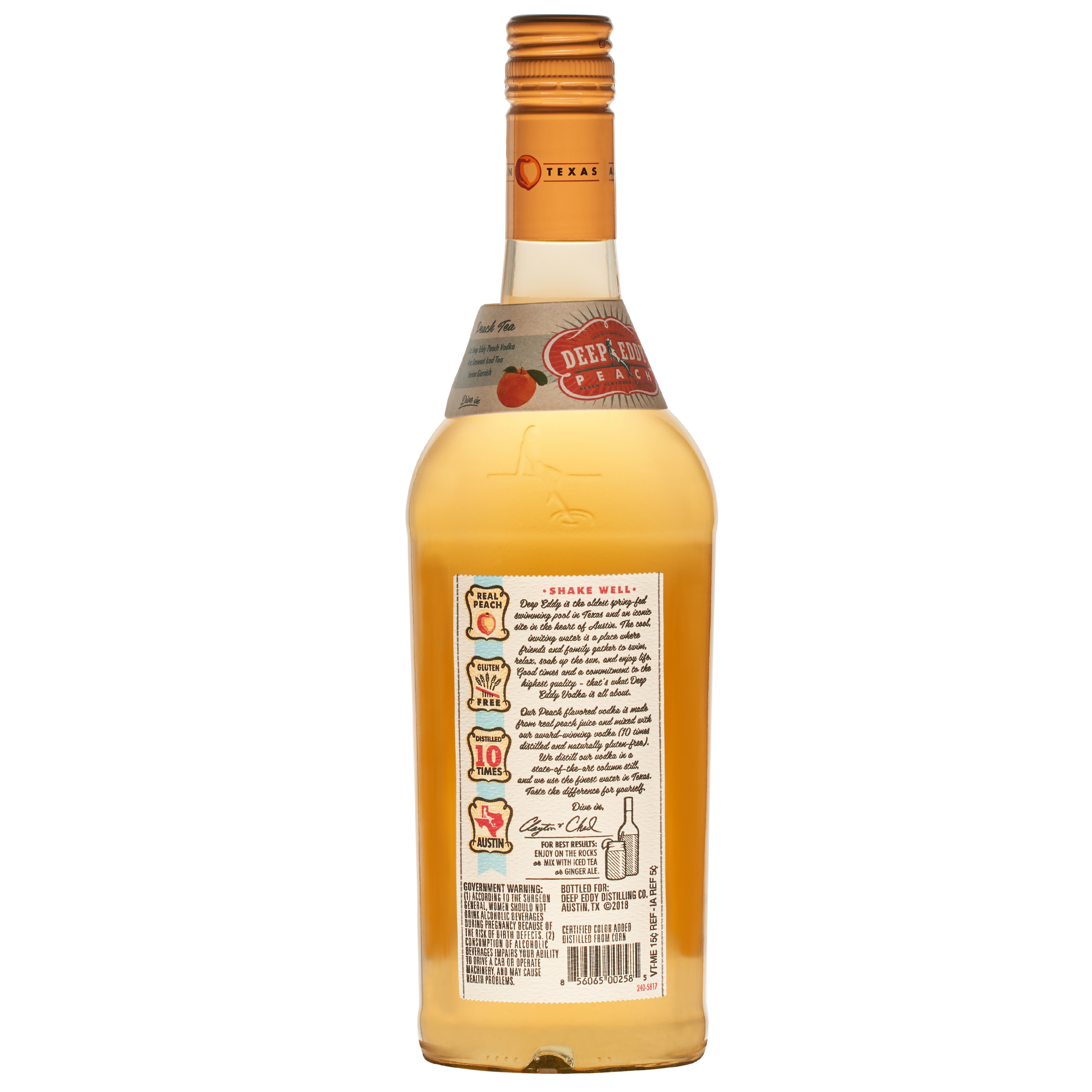 | Long Description | Deep Eddy Peach Vodka isn’t just a flavored spirit—it’s a sip of summer, a taste of sunshine, and a celebration of life’s easygoing moments. Crafted in Austin with our award-winning Original Vodka—distilled 10 times, filtered 8—and infused with real peach juice and a touch of pure cane sugar, it delivers vibrant, juicy flavor without artificial additives. Naturally gluten free and handcrafted in small batches, it’s smooth, refreshing, and versatile. Mix it with iced tea, lemonade, soda, or prosecco, or sip it simply over ice. From porch swings to backyard cookouts, Deep Eddy Peach makes every moment feel like a small celebration. Cheers to real flavor, good friends, and summer in a glass—any time of year. |