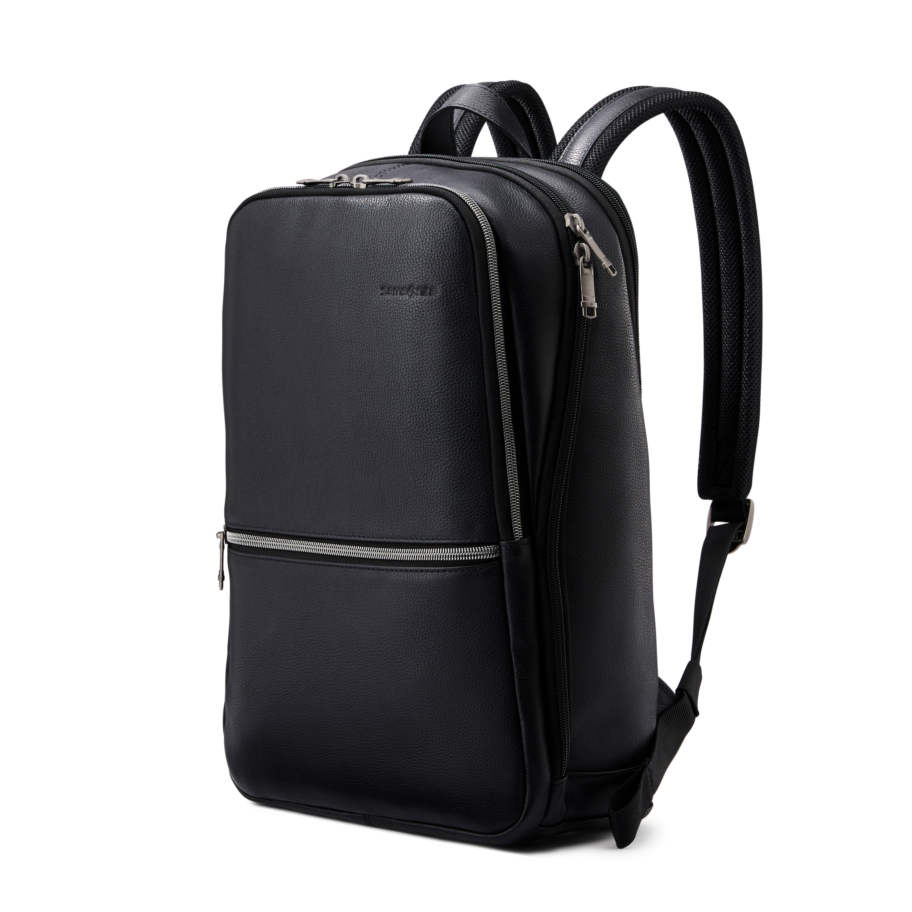 Brand Samsonite Collection Classic Leather Product ID 126036-1041 Product Name Slim Backpack EAN/UPC 043202878855 Construction PERSONAL GOODS Colour Black Warranty 3 Years Feature • Padded laptop pocket for extra protection. Fits most 14.1" laptops. • Adjustable padded air-mesh comfort straps. • Padded air-mesh back panel for comfort. • SmartSleeve™ allows you to slip the bag over most suitcase pull-handles so it can sit securely on top for hassle-free travel. • Constructed of genuine top-grain leather. Overall Depth/Length (in) 16 Overall Width (in) 5.5 Overall Height (in) 10.8 Packing Depth/Length (in) 16 Packing Width (in) 5.5 Packing Height (in) 10.8 Weight (lb) 2.469177336416 Capacity (litres) 15.574265625600002