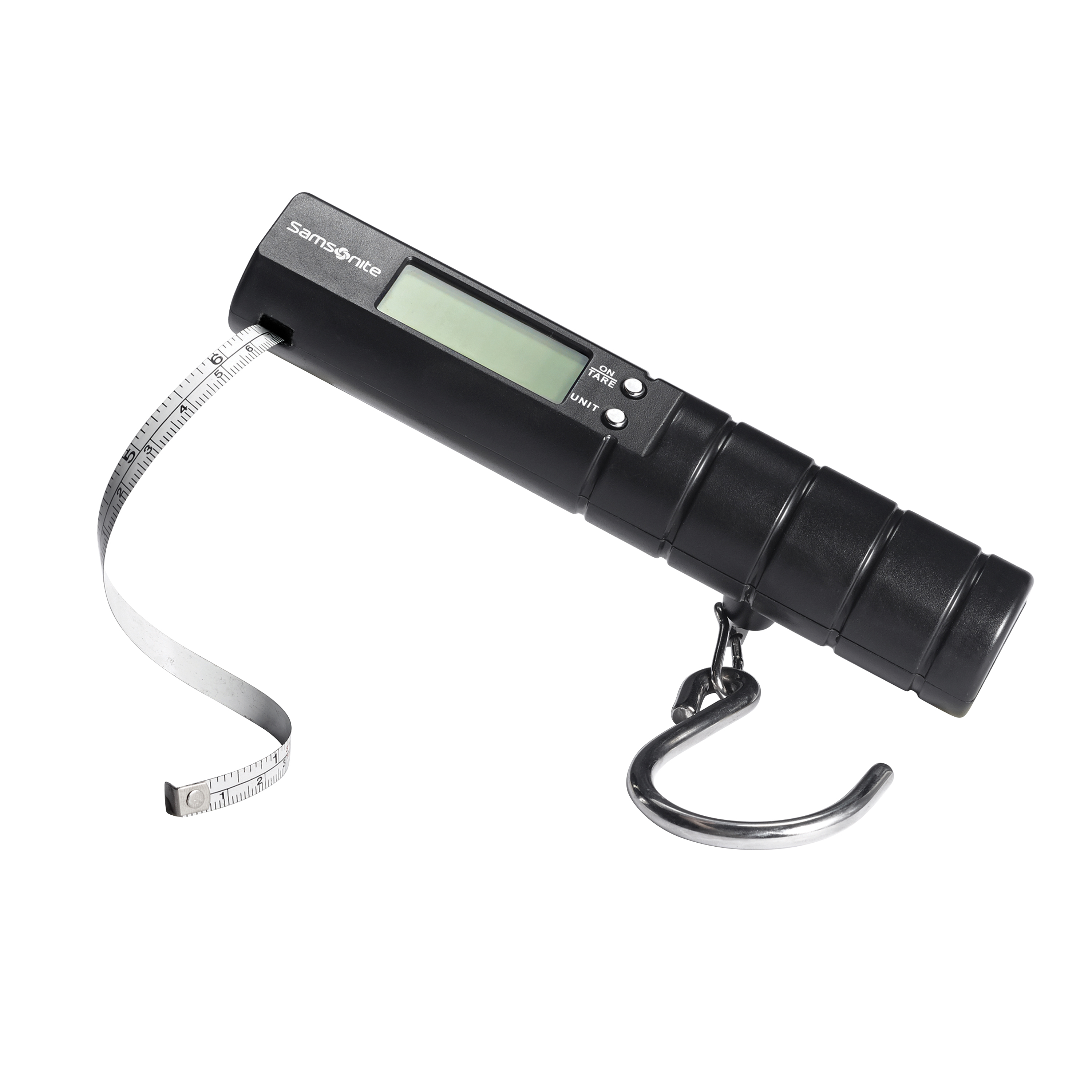 Brand Samsonite Collection Travel Accessories Product ID 144403-1041 Product Name Electronic Luggage Scale EAN/UPC 043202958670 Construction TRAVELWARE Colour Black Material ABS & Metal Feature • Don't be charged for overweight luggage again! • Compact and portable luggage scale with electronic read-out • Registers up to 80lbs • Integrated tape measure included • Overall Depth/Length (in) 6.3 Overall Width (in) 5.1 Overall Height (in) 1.2 Packing Depth/Length (in) 6.3 Packing Width (in) 5.1 Packing Height (in) 1.2 Weight (lb) 0.4 Capacity (litres) 0.6