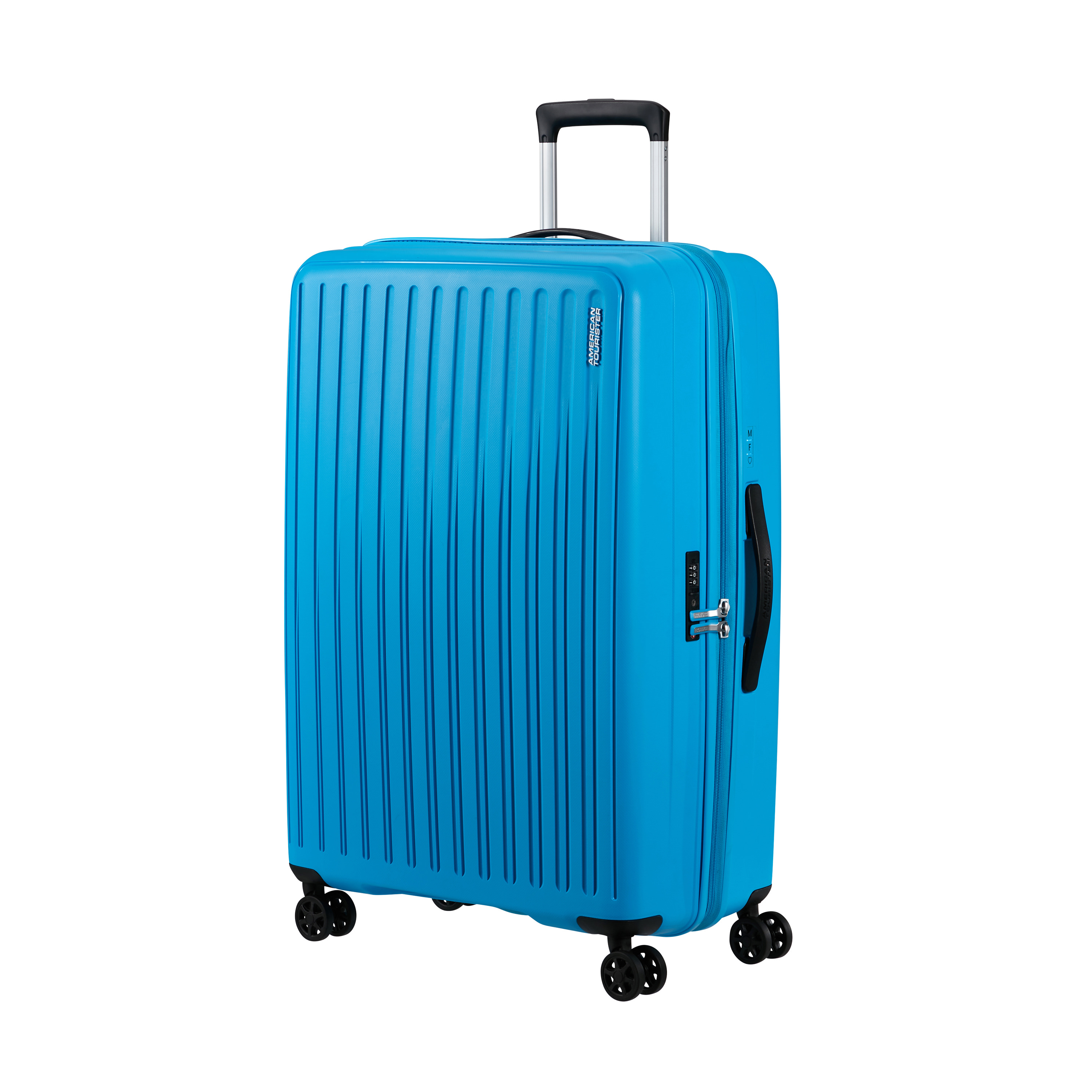 Brand American Tourister Collection Rejoy Product ID 156145-8198 Product Name Spinner Large EAN/UPC 049845348625 Construction HARDSIDE Colour Azure Blue Warranty 10 Years Feature • Four dual, airflow Spinner wheels so you can easily roll an upright case. • Expandability - Extra expansion on the case allows you to easily pack all your belongings. • Integrated TSA-approved lock provides added security when checking in your luggage. • Personalization stickers come with every letter in the alphabet with the addition of symbols and icons to customize your luggage. • The lining of this product was made from rPET fabric, made from plastic bottles used by consumers. Overall Depth/Length (in) 20.1 Overall Width (in) 11.5 Overall Height (in) 30.3 Packing Depth/Length (in) 19 Packing Width (in) 10.5 Packing Height (in) 27.1 Weight (lb) 9 Capacity (litres) 89
