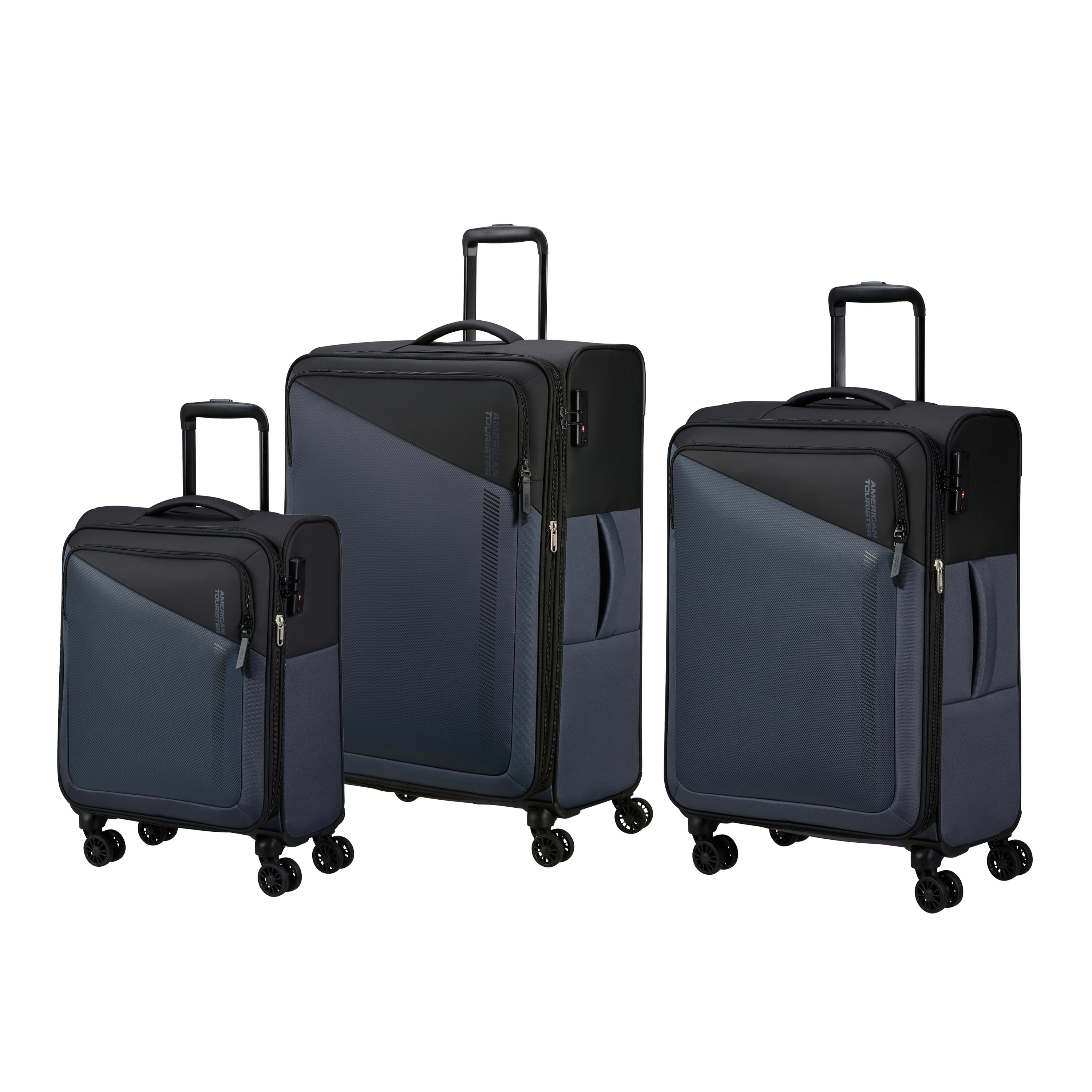 Brand American Tourister Collection Daring Dash Product ID 156147-1062 Product Name 3 Piece Set (CO/M/L) EAN/UPC 049845348861 Construction SOFTSIDE Colour Black/Grey Warranty 10 Years Feature • Four dual, airflow Spinner wheels so you can easily roll an upright case. • Lightweight design. • Expandability - Extra expansion on the case allows you to easily pack all your belongings. • Mounted TSA-approved lock provides added security for your belongings. • Meets most Carry-On* requirements. *Carry-On size and weight allowances vary by airline Overall Depth/Length (in) 19 Overall Width (in) 12 Overall Height (in) 30 Packing Depth/Length (in) 18.5 Packing Width (in) 9.2 Packing Height (in) 25.8 Weight (lb) 20.7 Capacity (litres) 72