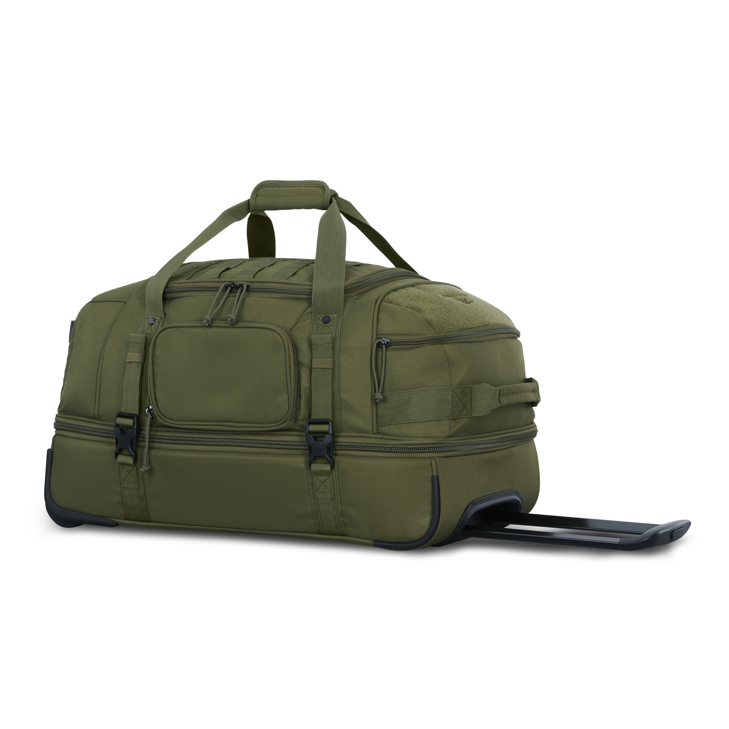 Collection Pathsetter Product ID 158039-1576 Product Name 22" Wheeled Duffle EAN/UPC 040176545141 Construction SOFTSIDE Colour Moss Warranty 5 Years Feature • Large drop-bottom compartment • In-line skate wheels • Internal compression straps and fabric partition section • Push-button locking handle • Multiple pockets Overall Depth/Length (in) 11.8 Overall Width (in) 12.6 Overall Height (in) 22.1 Packing Depth/Length (in) 11.8 Packing Width (in) 12.6 Packing Height (in) 22.1 Weight (lb) 5.3 Capacity (litres) 67