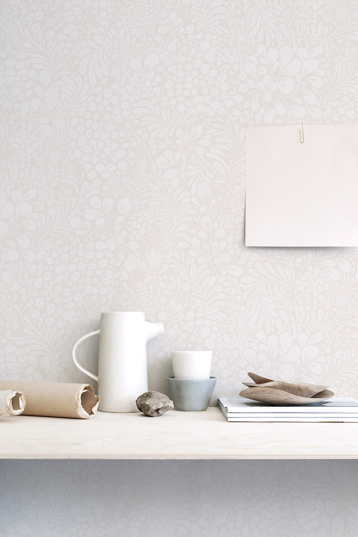 | Dynamic Description | Create a calm and welcoming space in your home with this Scandinavian-inspired wallpaper. Delicate florals and lush leafy trees inked in white twist together against a light grey backdrop. Siv is an unpasted, non woven wallpaper. |