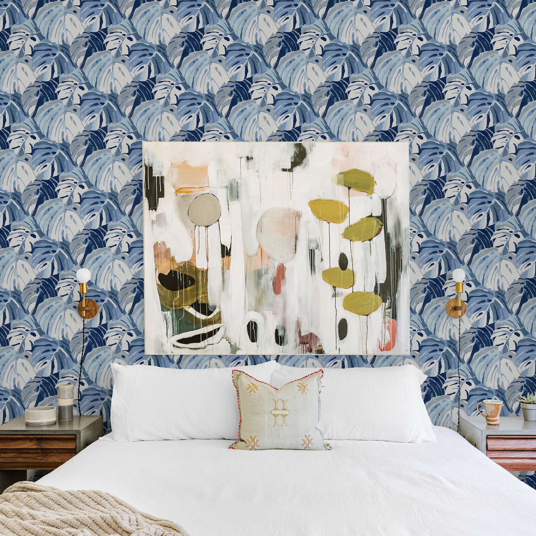 | Dynamic Description | Create the perfect tropical retreat with this soothing botanical design. Monstera leaves inked in shades of blue and white overlap one another to form a canopy for you to get lost in. Samara is an unpasted, non woven wallpaper. |