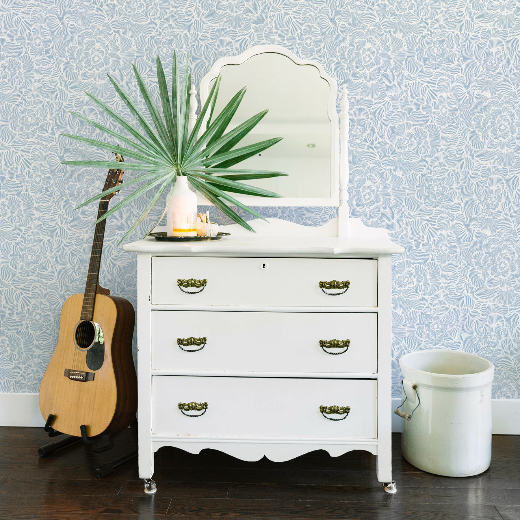| Description + Bullets | Blooms appear to unfurl before your very eyes in this dynamic floral wallpaper. Set against a grasscloth patterned background, each petal is composed of strong strokes of blue raised inks, giving each flower texture and a sense of motion. Periwinkle is an unpasted, non woven wallpaper. Unpasted non woven material; 10.4-in repeat, drop match; Washable and strippable; 20.5-in by 33-ft long roll; Covers about 56.4 square feet |
