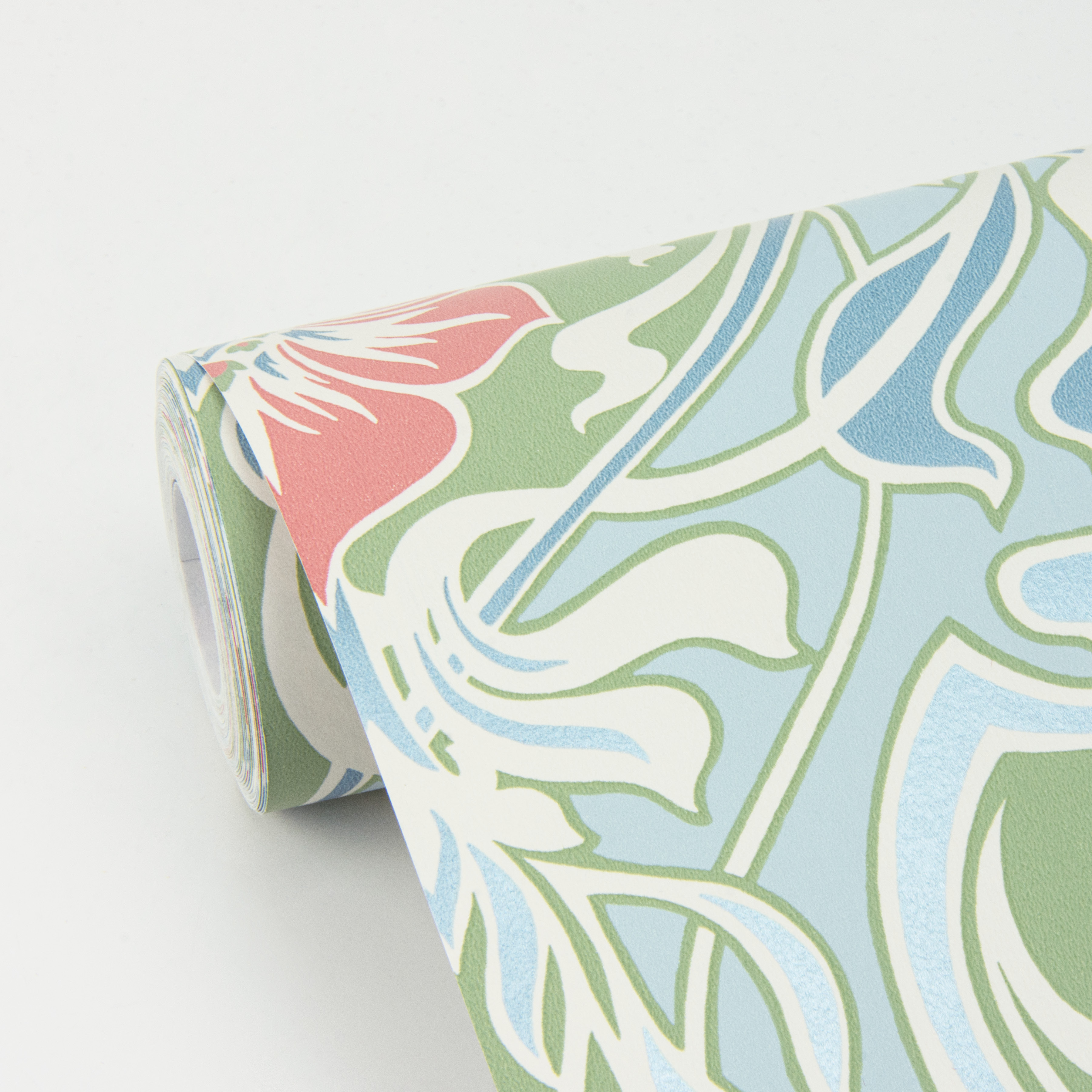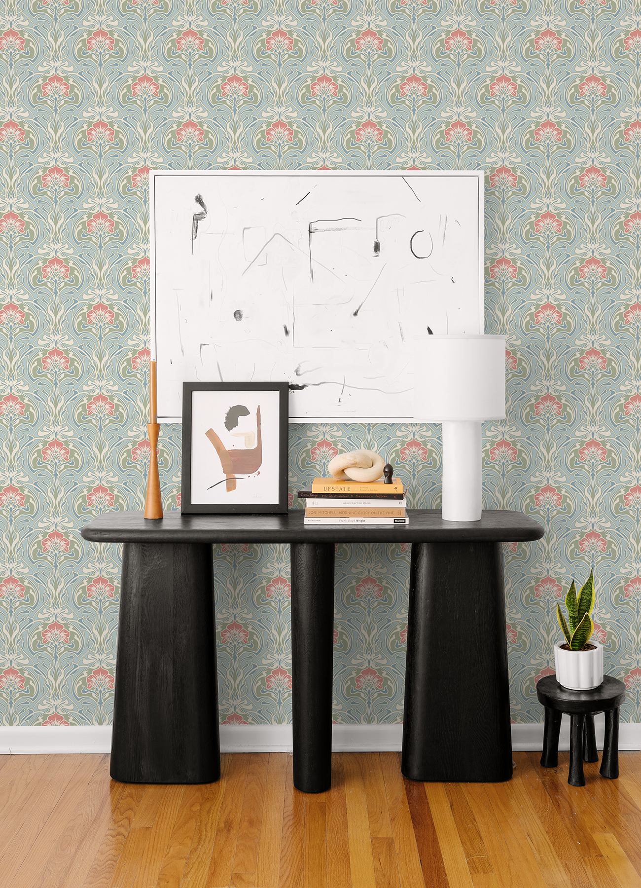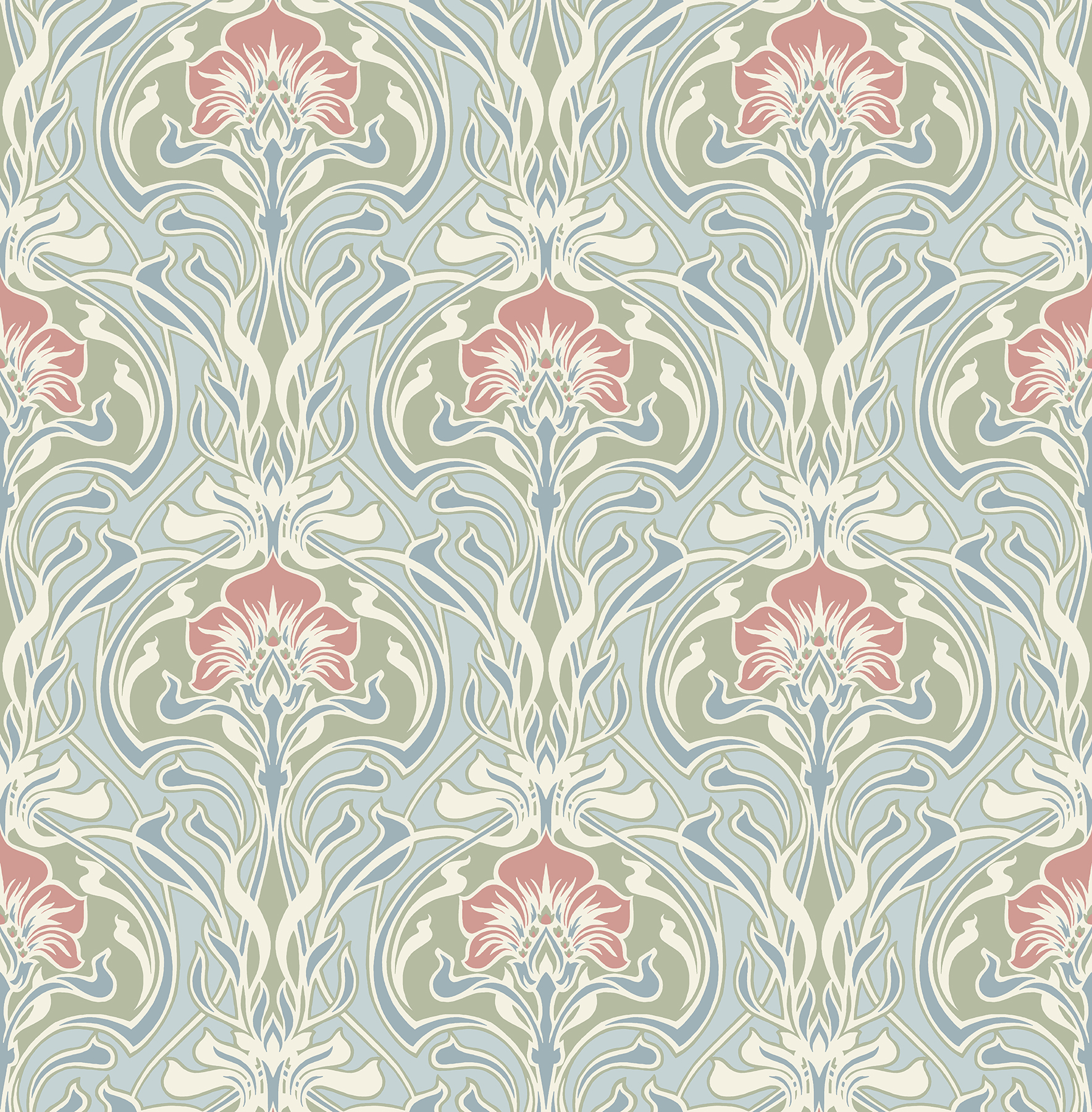 | Dynamic Description | Bring fresh, spring-time elegance to your walls with this stunning, Art Nouveau-inspired design. Pink flowers accented by green color-blocking are framed by an intricate, woven collection of vines accented with metallic blue touches. Mucha is an unpasted, non woven wallpaper. |