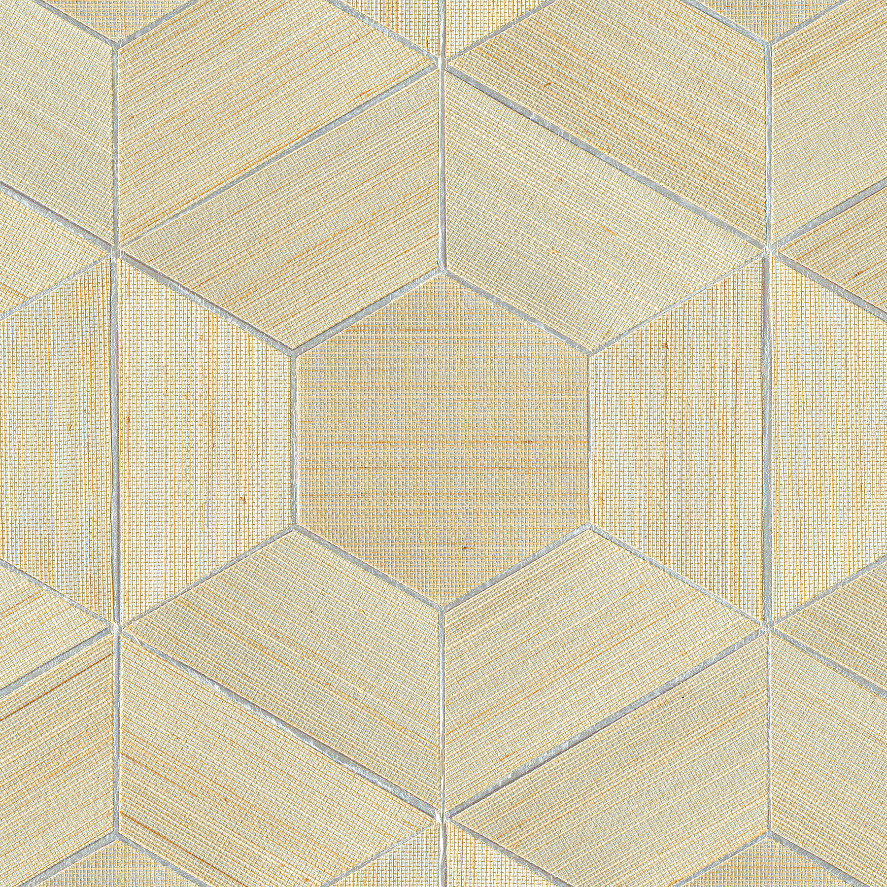 | Dynamic Description | Grasscloth meets geometric in an entirely new way in this wallpaper. Thin strands of golden tan grasses are woven onto a metallic silver backdrop, then cut into trapezoid and hexagon pieces and assembled into a honeycomb structure along a silver backdrop. Linzhi is an unpasted, abaca grasscloth inlay wallpaper. |