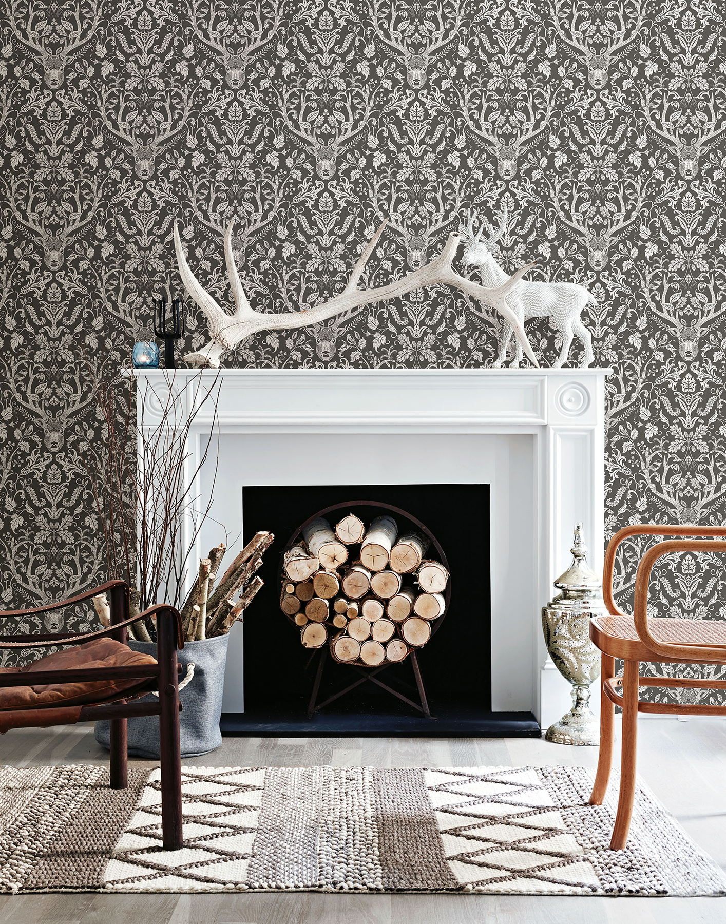 | Dynamic Description | Whimsical meets lodge with this enchanting brown and white wallpaper. Curling forest vines, charming songbirds and majestic stags make up this dreamy damask print, while its hand drawn style emphasizes its fanciful design. Kiwassa is a prepasted, easy walls wallpaper. |