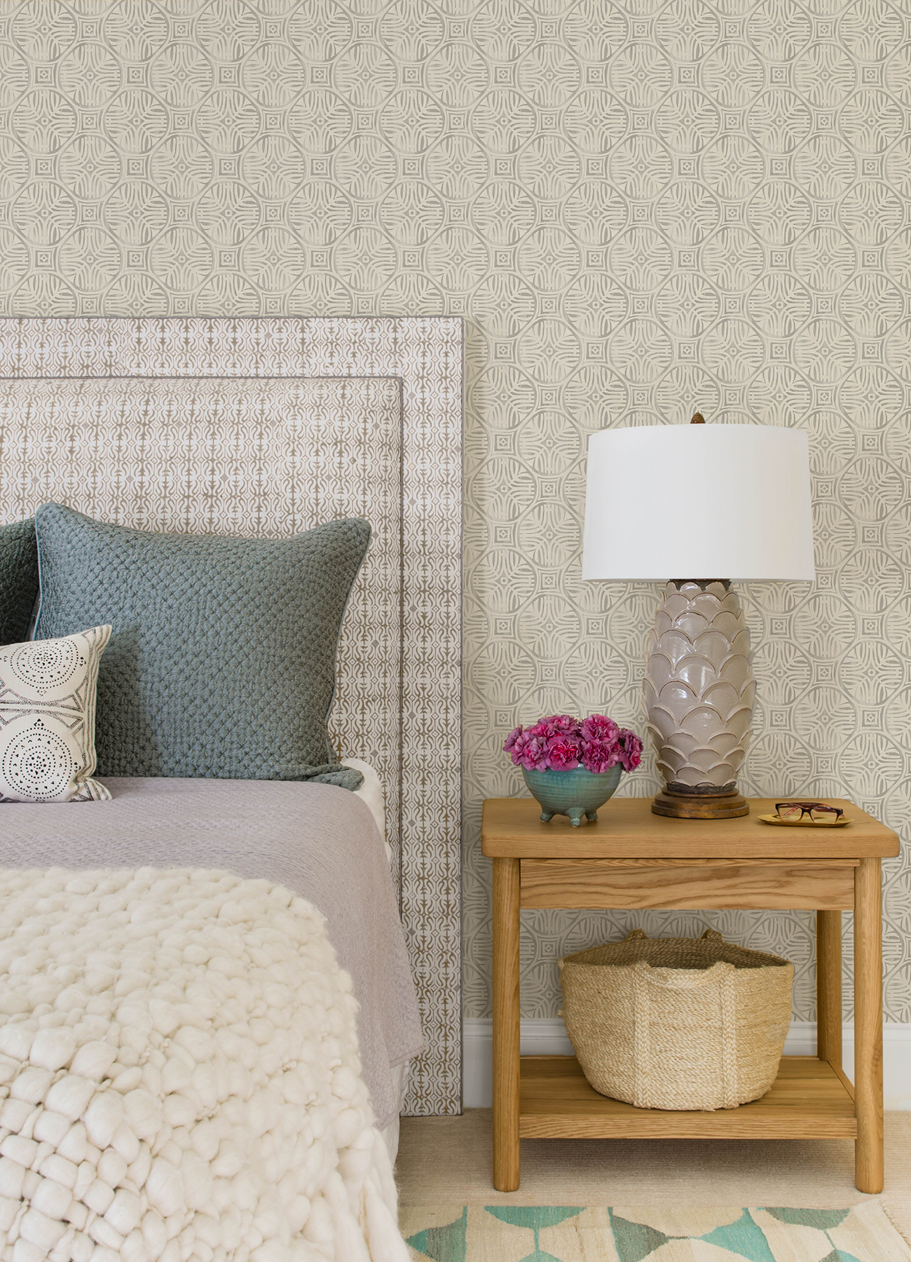 | Dynamic Description | Intricate white detailing decorates steel-grey circular medallions and square spacers in Sandee Medallion. Sandee is a prepasted, sure strip wallpaper measuring 20.5 inches wide by 33 feet long, covering approximately 56.4 square feet per roll. |