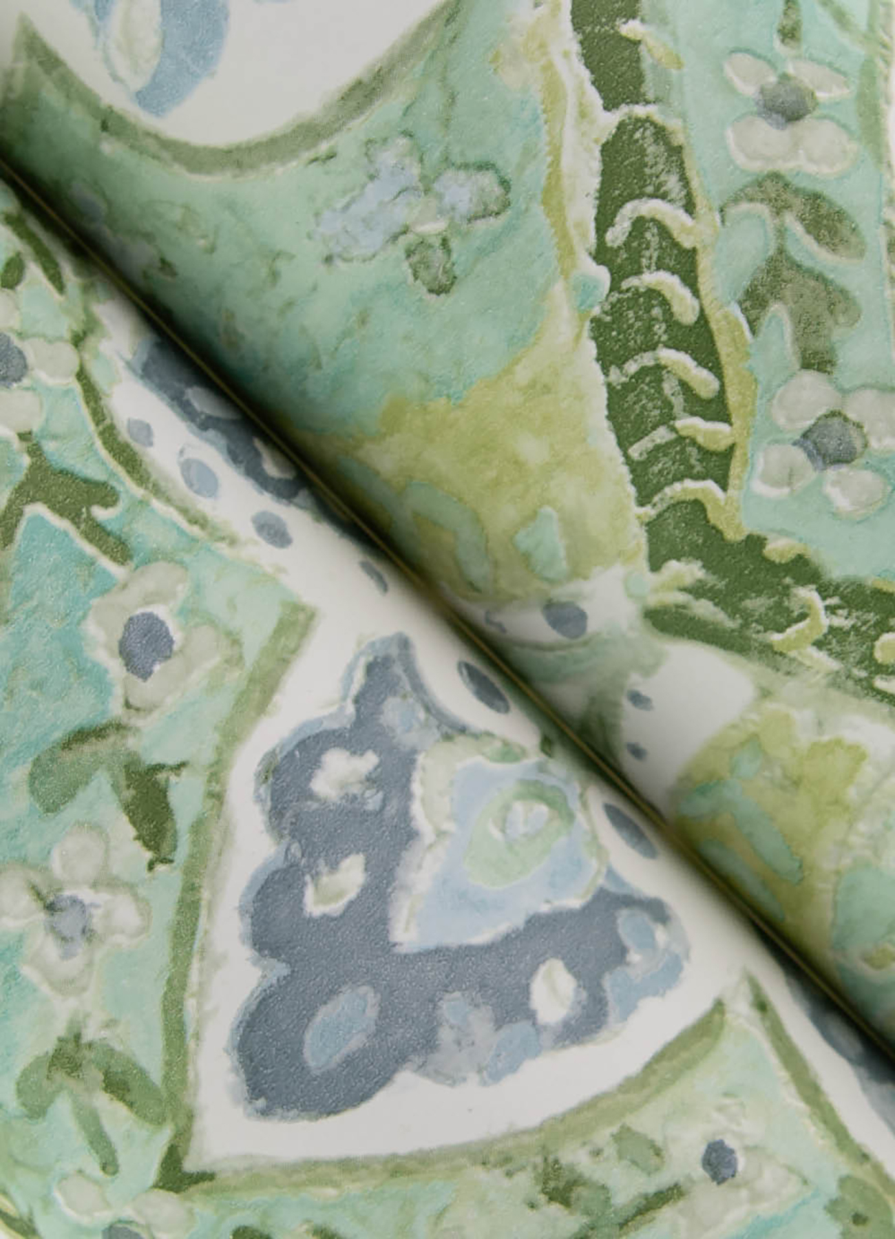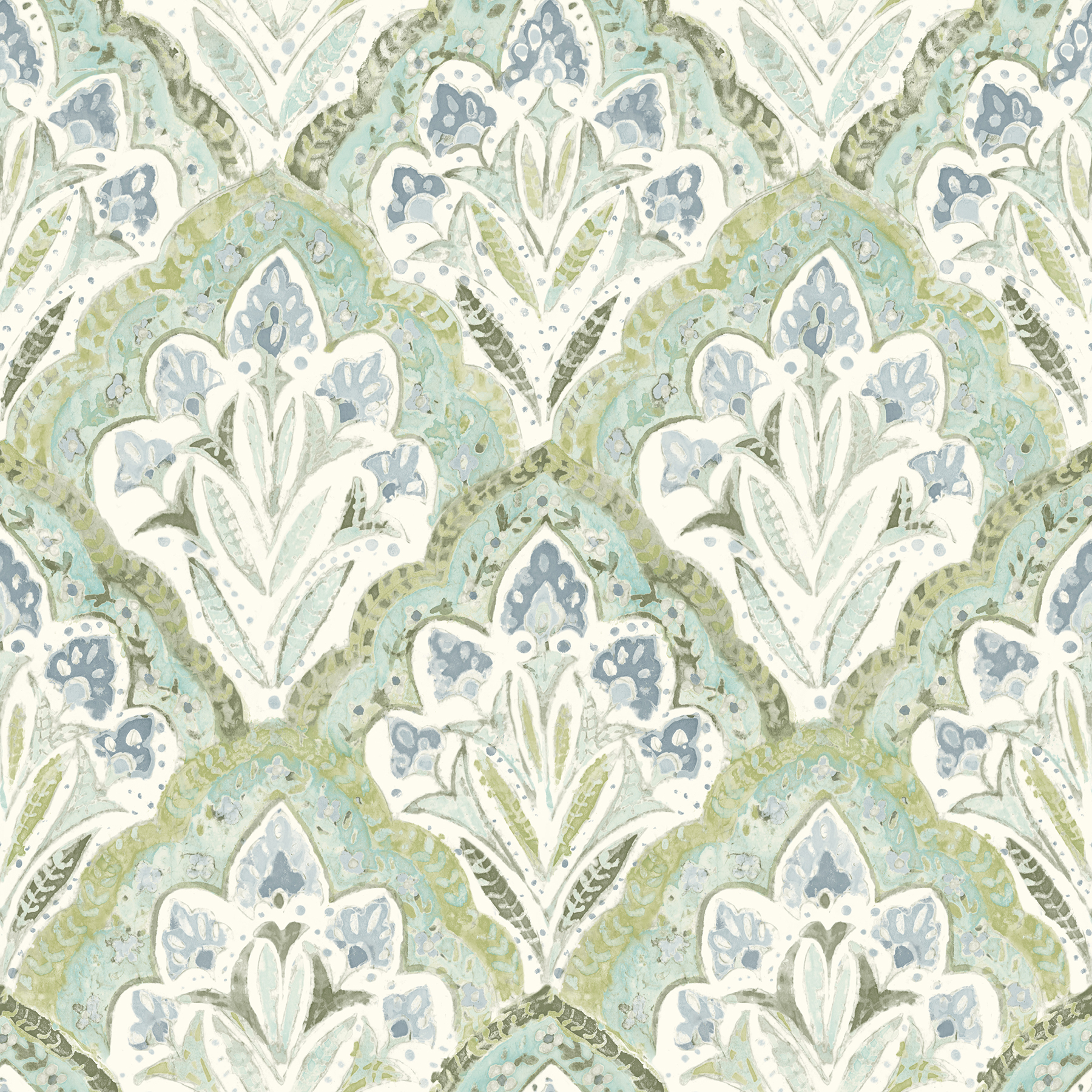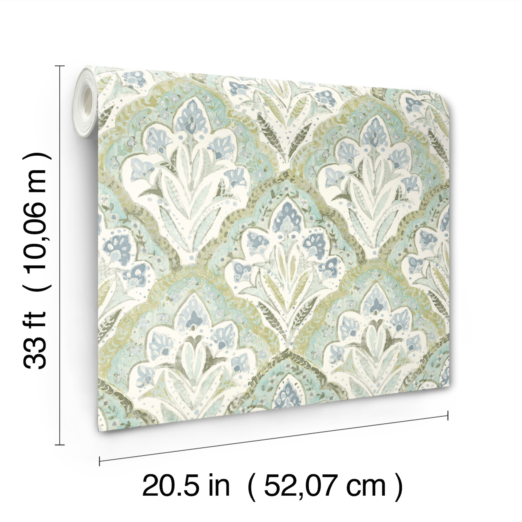 | Description + Bullets | Imbued with all the comforts of a handmade quilt, this design features a scalloped damask with floral detailing and a charming palette of aquamarine, lime, cornflower blue, and white. Mimir is a prepasted, sure strip wallpaper measuring 20.5 inches wide by 33 feet long, covering approximately 56.4 square feet per roll. Prepasted sure strip material; 20.5-in repeat, straight match; Washable and strippable; 20.5-in by 33-ft long roll; Covers about 56.4 square feet |