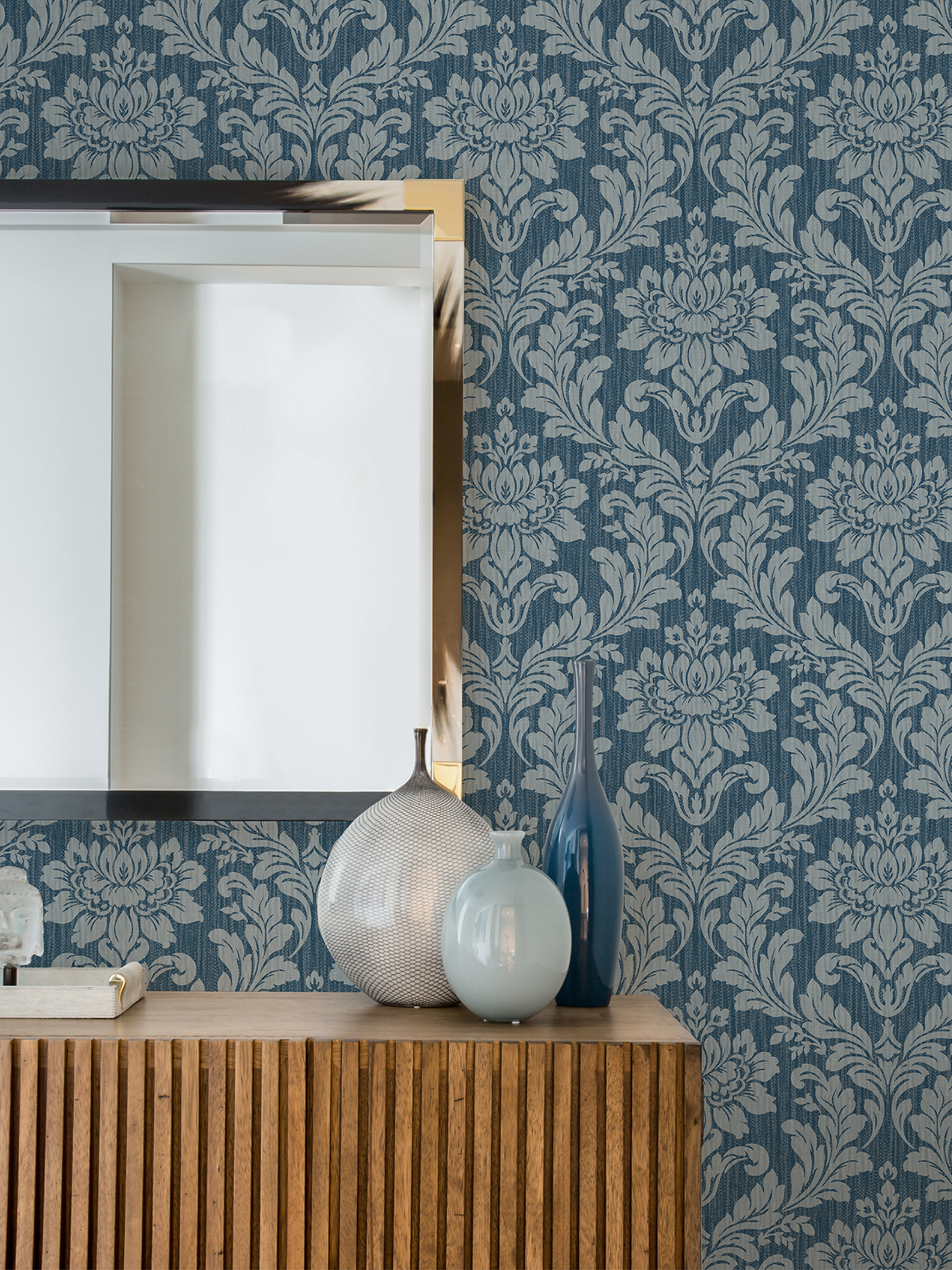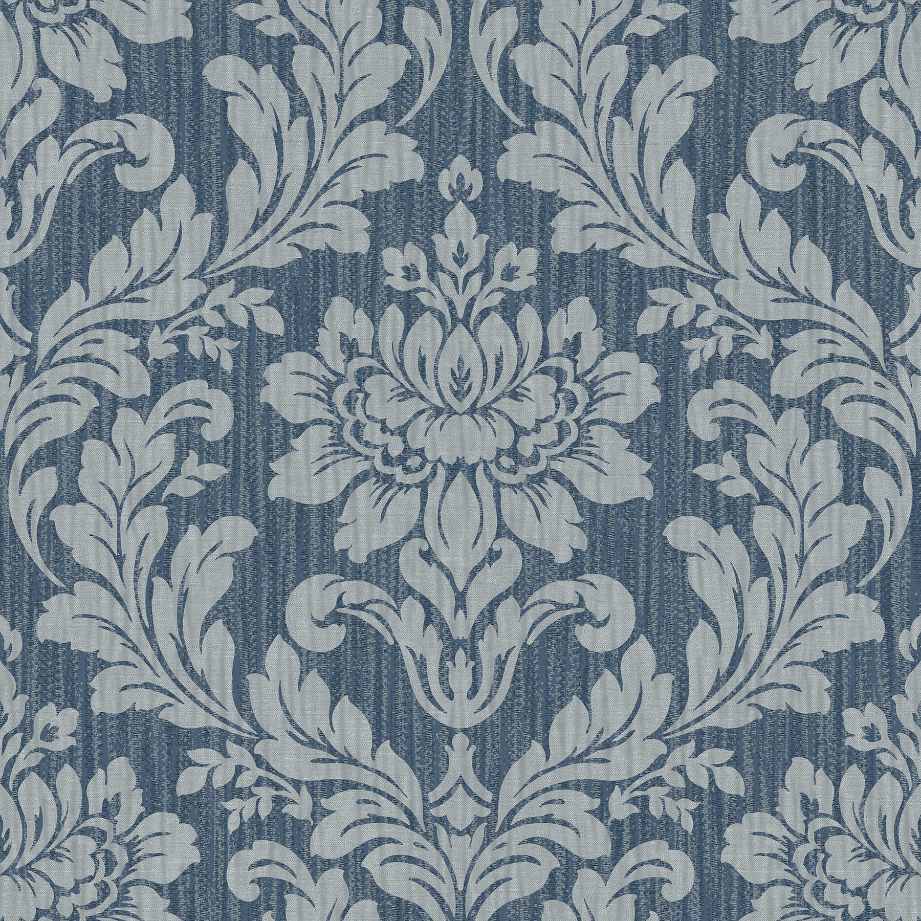 | Dynamic Description | Give your home a sophisticated touch with this classic damask print. Each metallic light blue motif is comprised of an embellished flower surrounded by leafy scrolls and lies against a distressed blue backdrop. Galois is an unpasted, vinyl on paper wallpaper. |