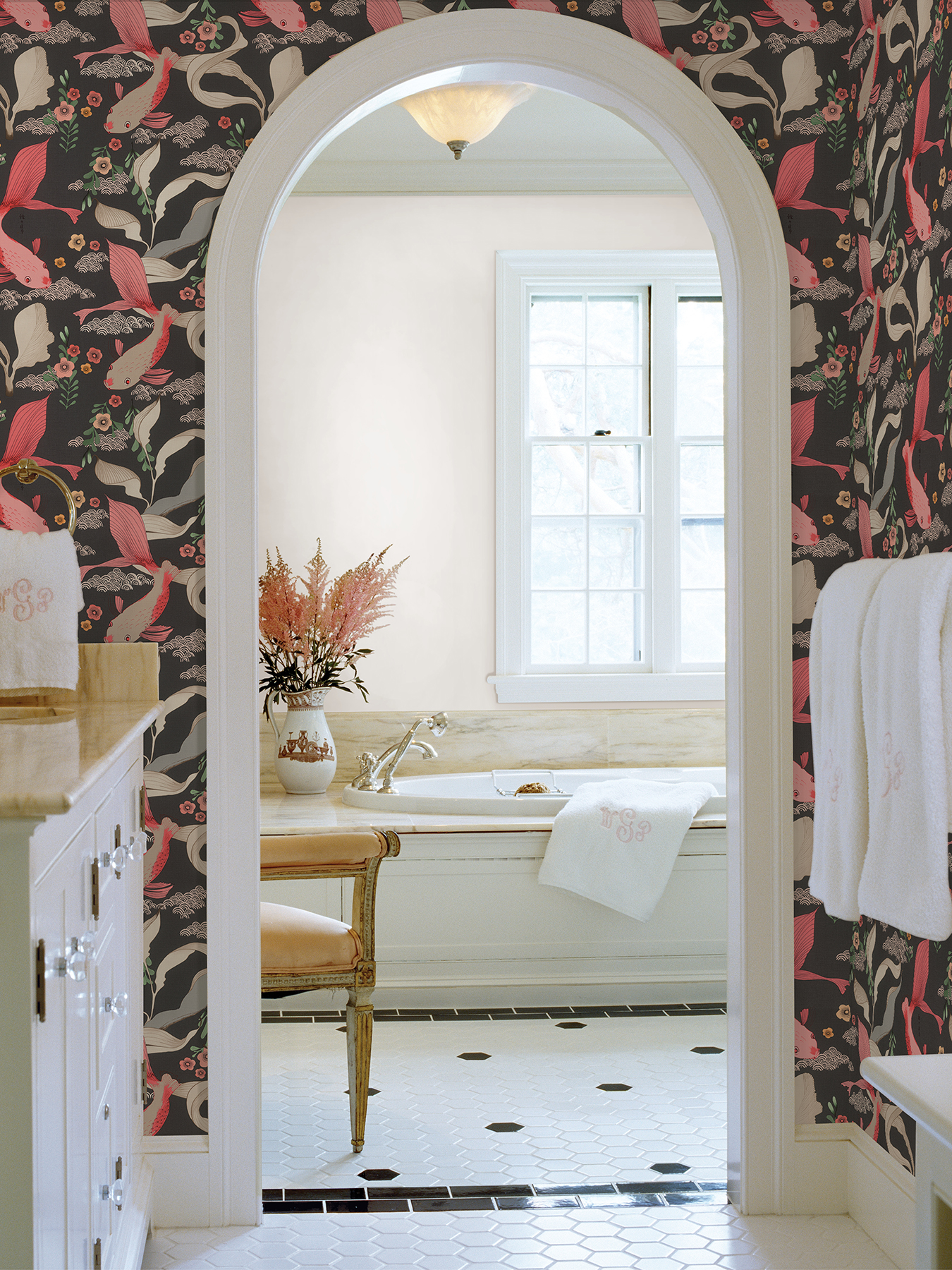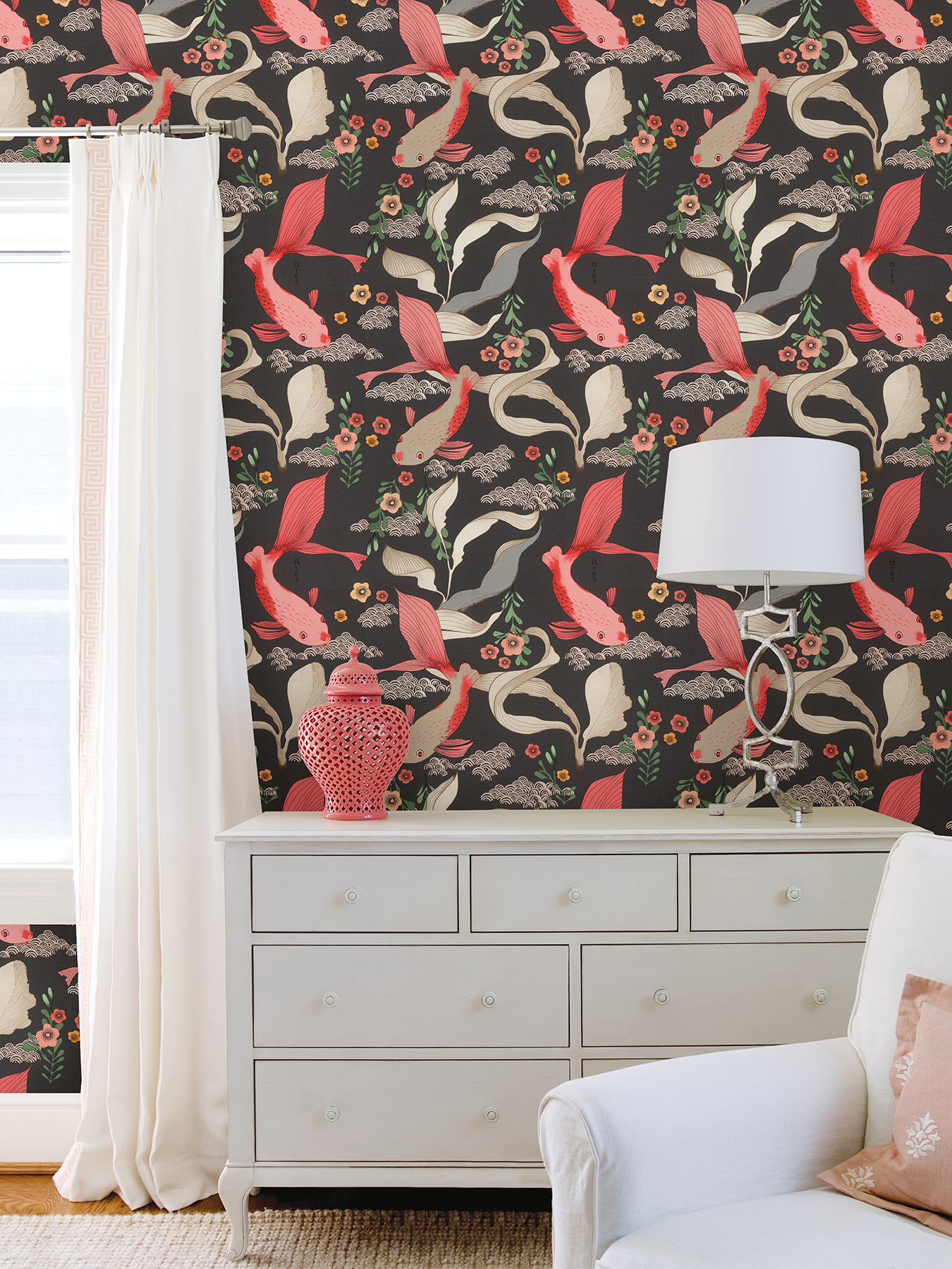 | Dynamic Description | Add a spark of magic to your interiors with this whimsical wallpaper! Large-scale fish seem to swim through land and sea, the stylized illustrations featuring both seaweed and flowers. The design's vibrant pinks and soothing beige hues are richly offset by a charcoal faux linen backdrop. Dai is an unpasted, vinyl on non woven wallpaper. |