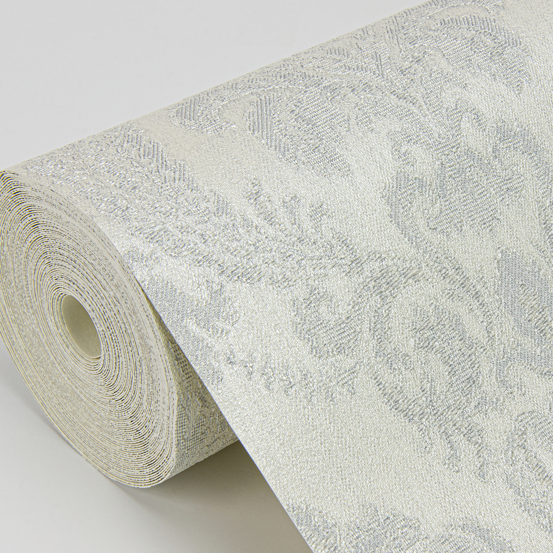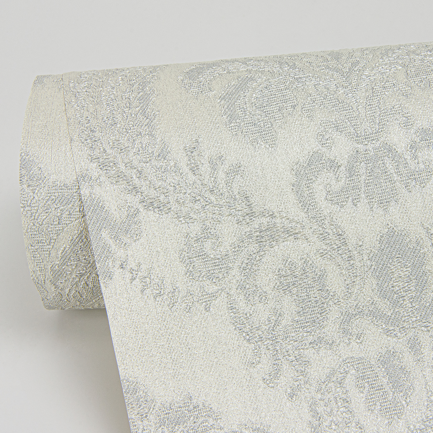 | Dynamic Description | Bring regal grandeur to your home with this lavish silver damask wallpaper! The embellished leafen scrolls are imbued with lace raised ink detailing, the pale silver background finished with a glossy sheen. Renatta is an unpasted, vinyl wallpaper. |