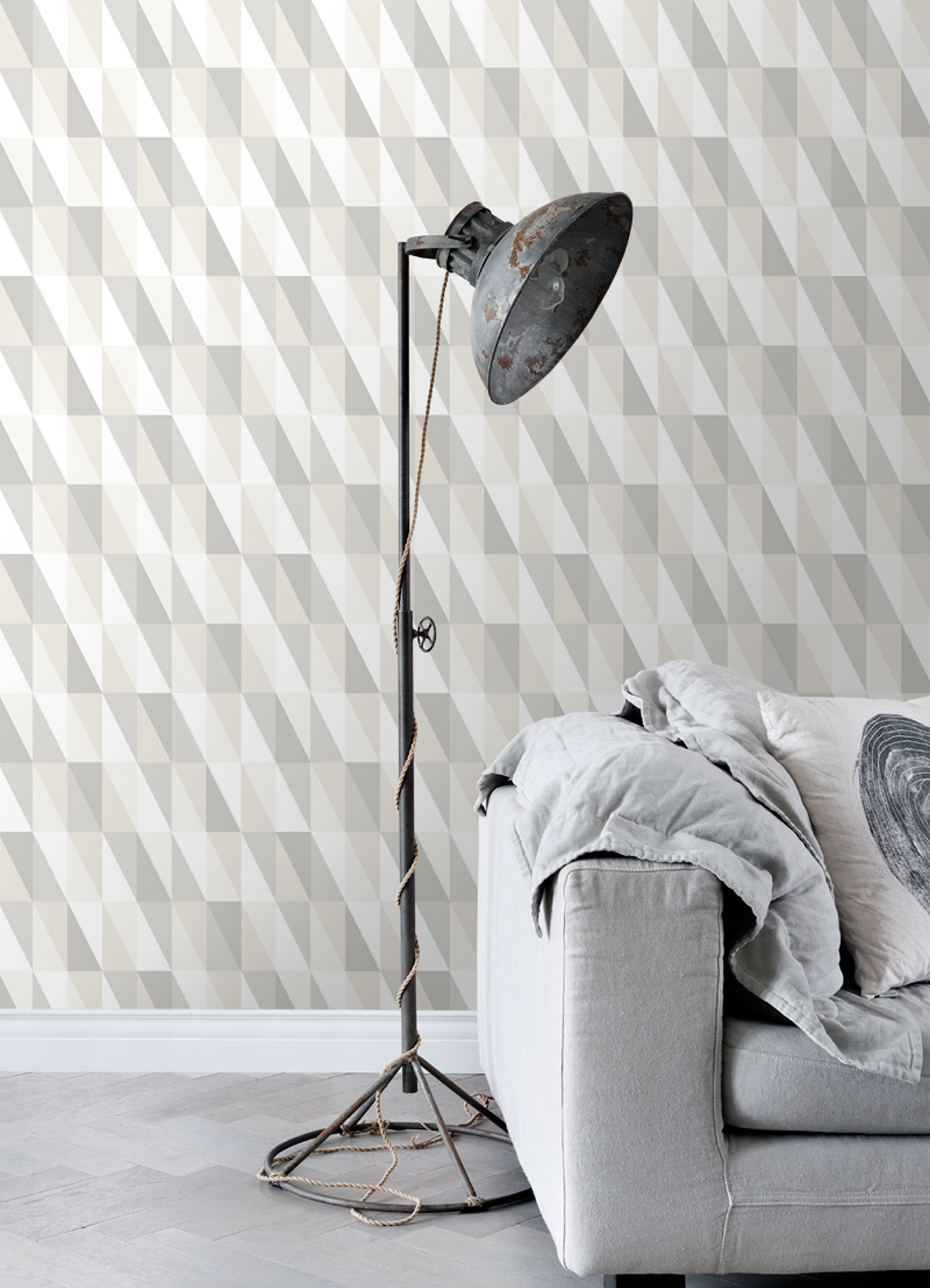 | Dynamic Description | Sleek and modern, this geometric print is a perfect accent for any neutral design. Rows of triangles alternate between shapes of grey, taupe, white, and metallic silver. Inez is an unpasted, non woven wallpaper. |