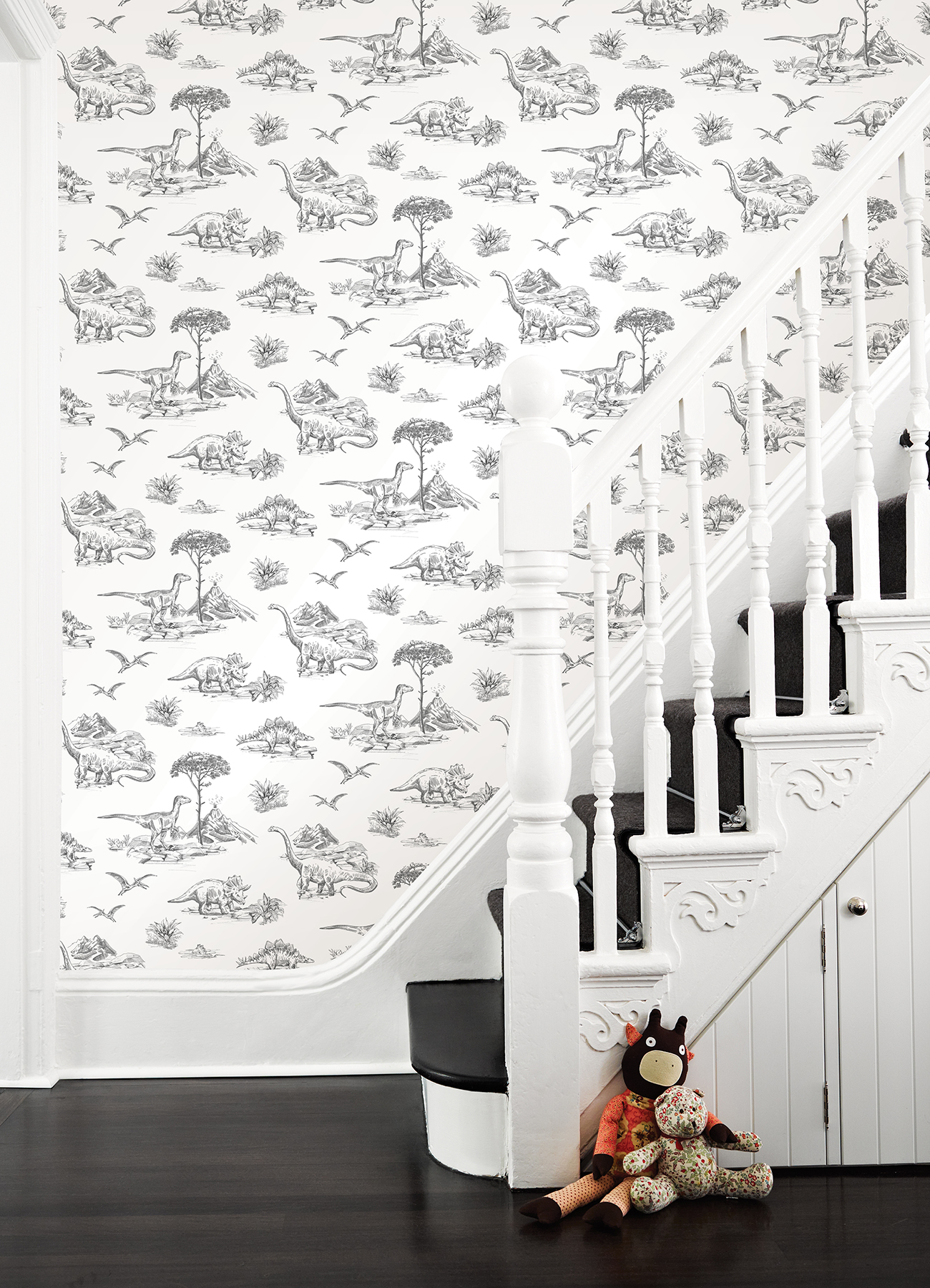 | Dynamic Description | Take a trip to the Triassic period with this illustrative print! Dinosaurs prowl land and sea, sketched in grey inks along a crisp white background. Isolde is an unpasted, non woven wallpaper. |