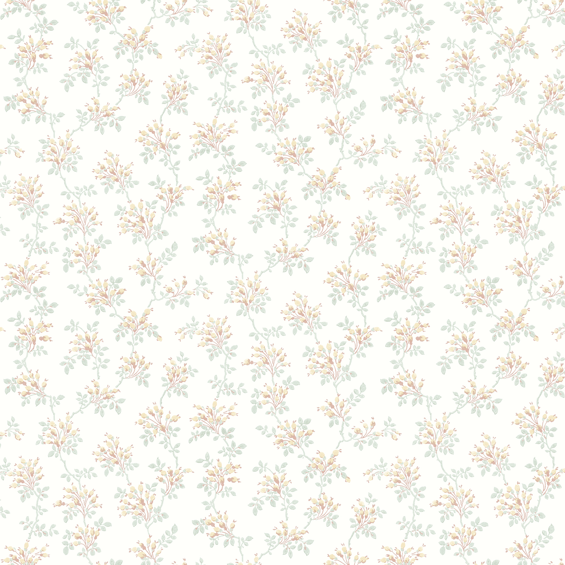 | Dynamic Description | Indulge in the traditional beauty of a floral trail print. Yellow and terracotta buds form clusters on pale blue vines that twine along a soft white backdrop. Sofiane is a prepasted, sure strip wallpaper. |
