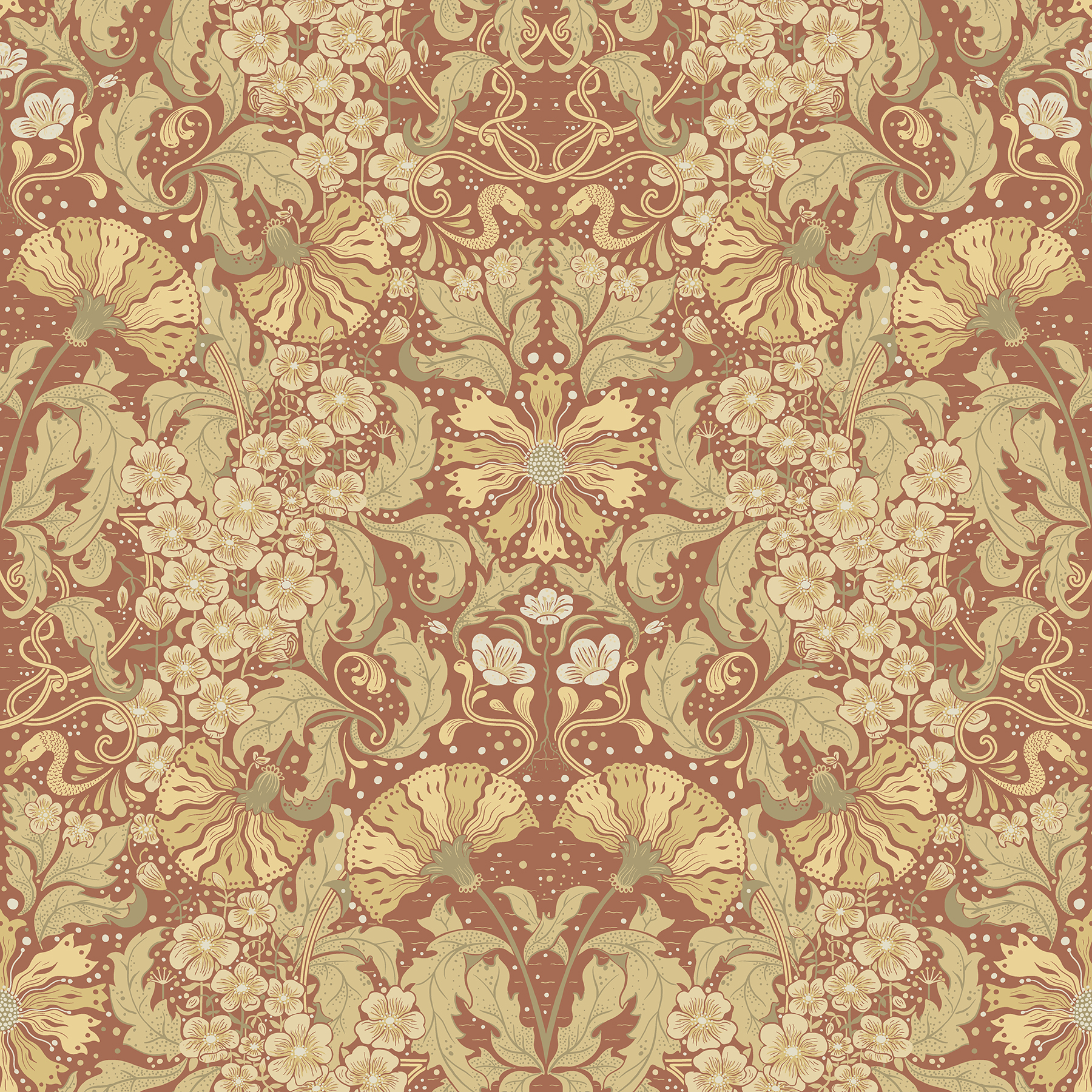 | Dynamic Description | This lush and romantic floral wallpaper will elevate your walls with its feminine sophistication! The ornate, Art Nouveau design features golden, fan-like flowers framed by large leaves and a waving column petite, white blooms. The rust-red backdrop adds an extra layer of luxury to its intricate styling. Ojvind is an unpasted, non woven wallpaper. |