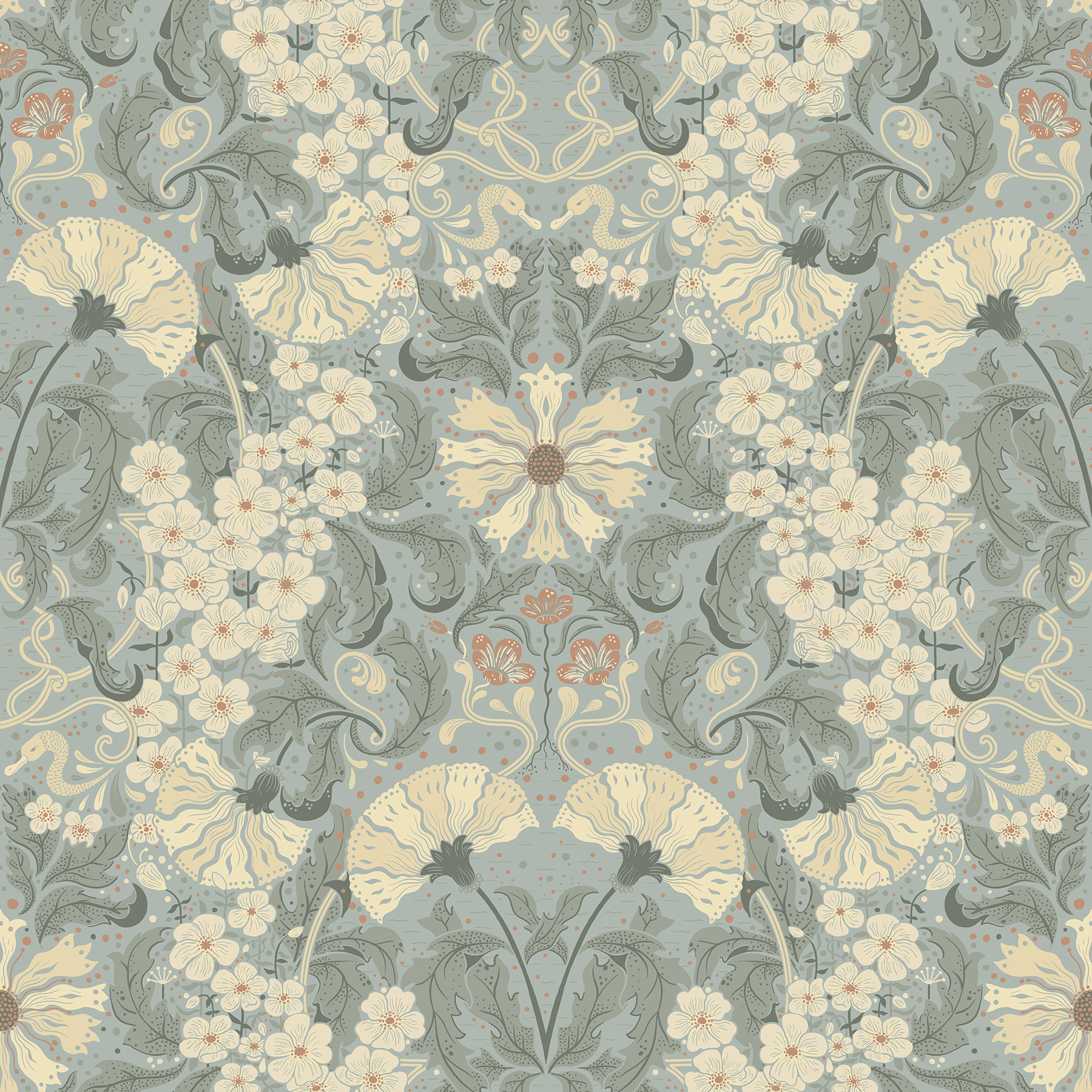 | Dynamic Description | This exquisite floral wallpaper brings timeless romance to your interiors. The Art Nouveau design features fanning florals framed by scrolled leaves and a waving column of petite white blooms, the cool blues elevated by hints of coral. Ojvind is an unpasted, non woven wallpaper. |