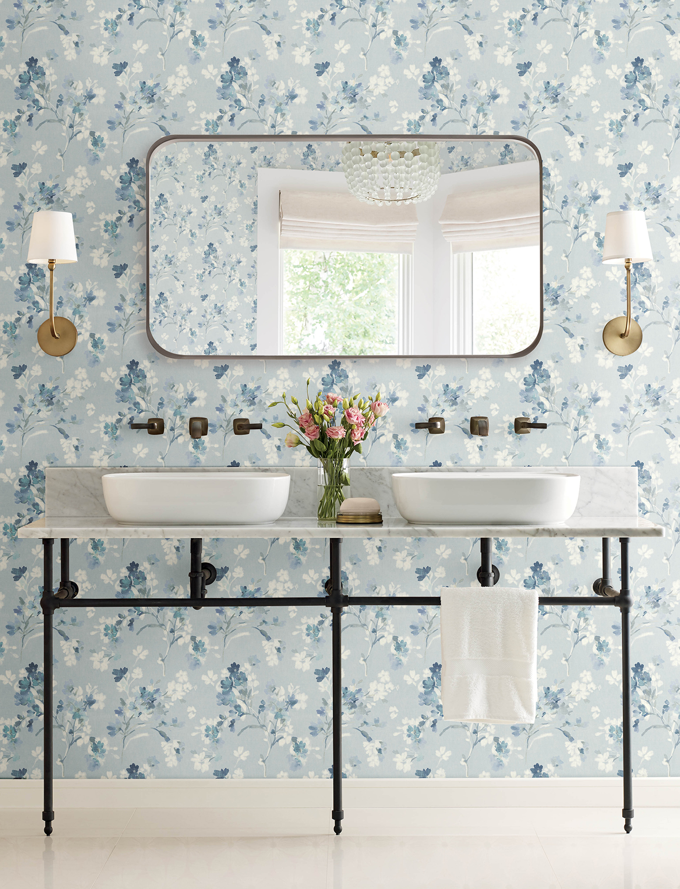 | Dynamic Description | Feminine and elegant, this botanical wallpaper features boughs of fresh blue and white blossoms resting along a pale blue linen textured backdrop. Azalea is a prepasted, sure strip wallpaper measuring 20.5 inches wide by 33 feet long, covering approximately 56.4 square feet per roll. |